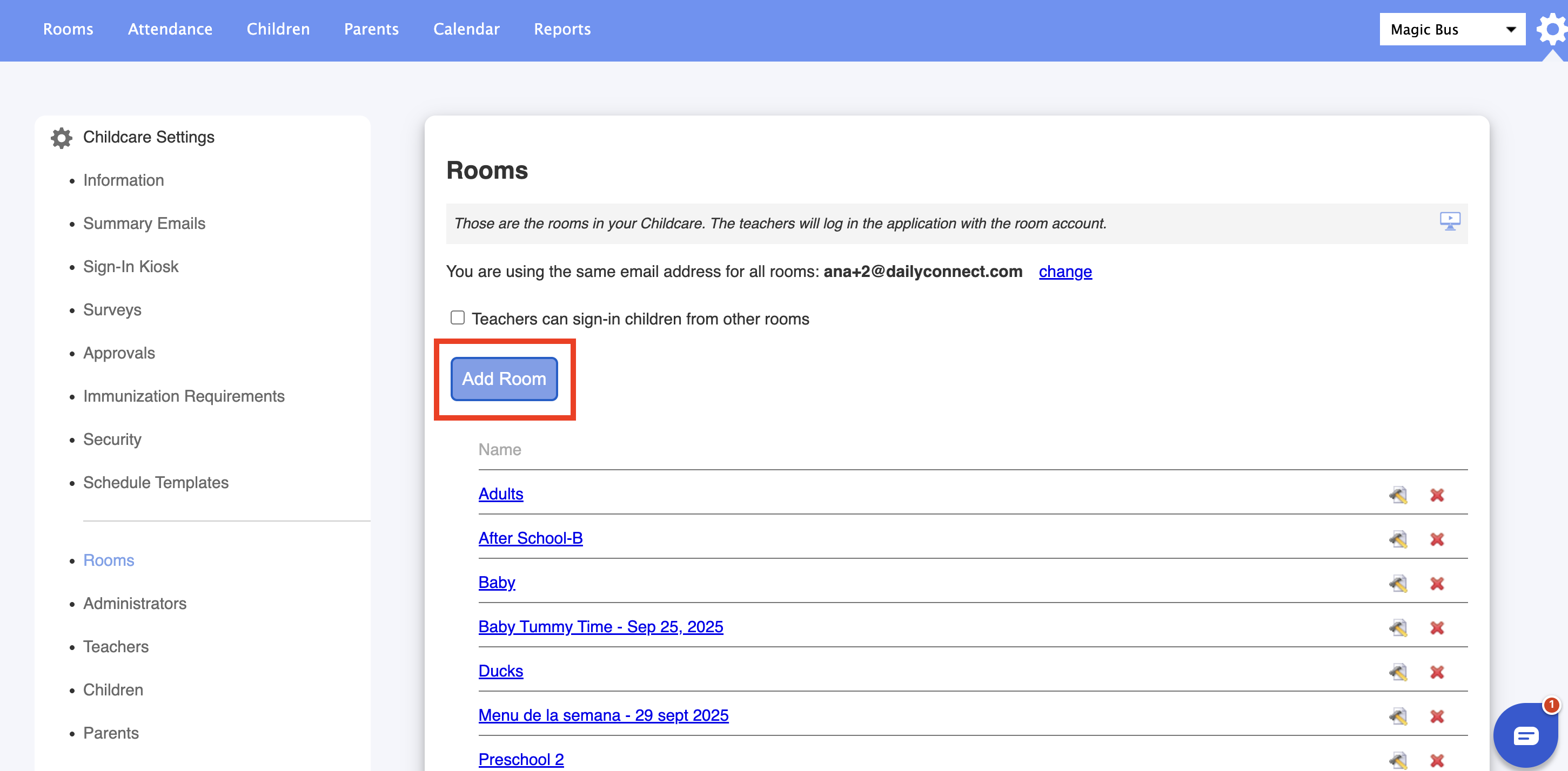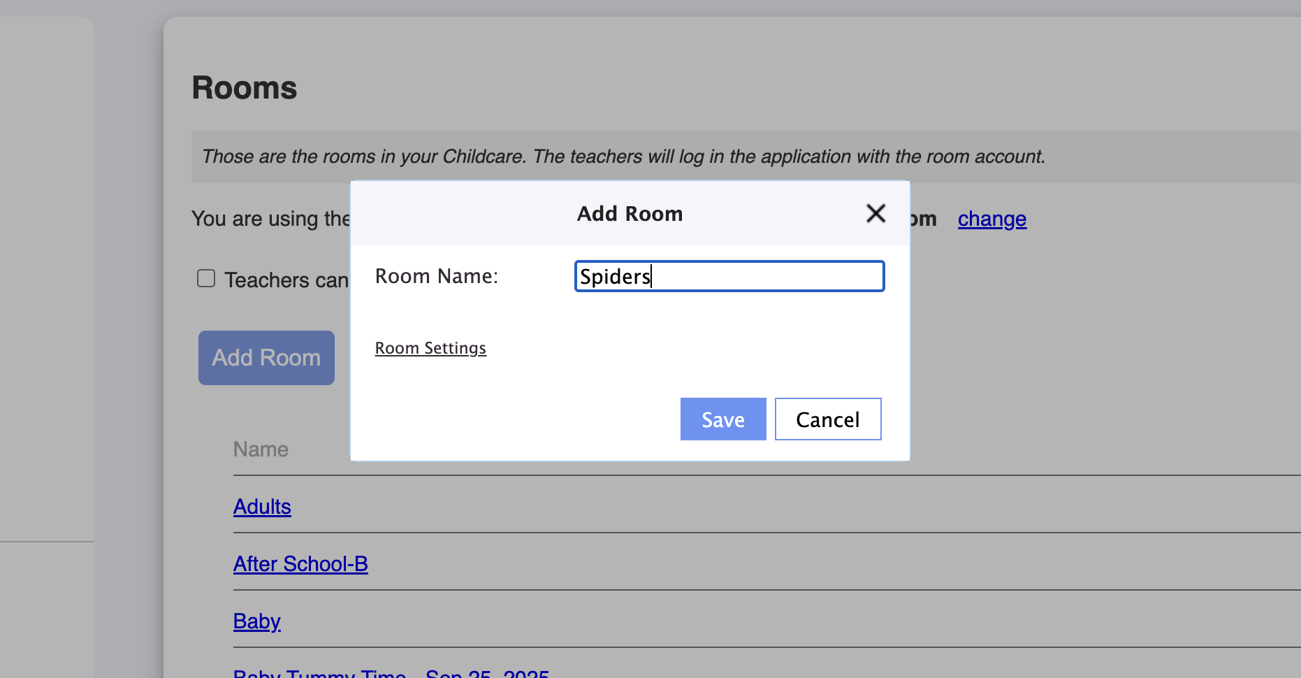 1. Classrooms are set up in the Settings > ChildCare Settings > Rooms page via an administrator account.