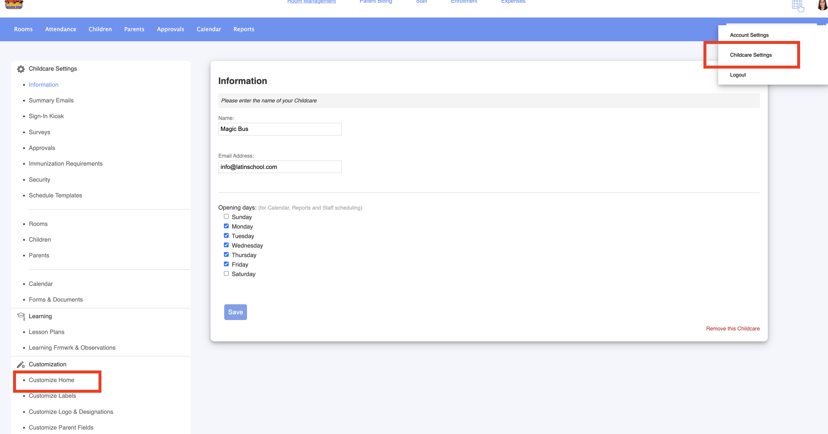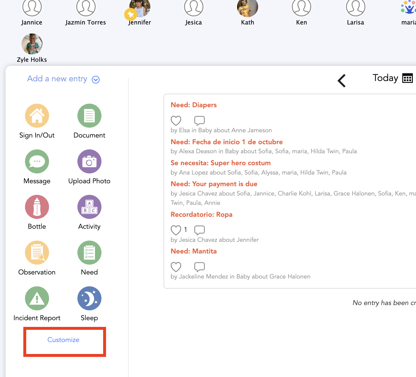 Daily Connect allows you to customize your homepage and labels according to the needs of individual classrooms. By customizing the homepage, you can add, remove and reorder the categories that will be available for each classroom. Customizing labels allows you to change the title of each entry as well as how such an entry will appear on a child’s timeline.