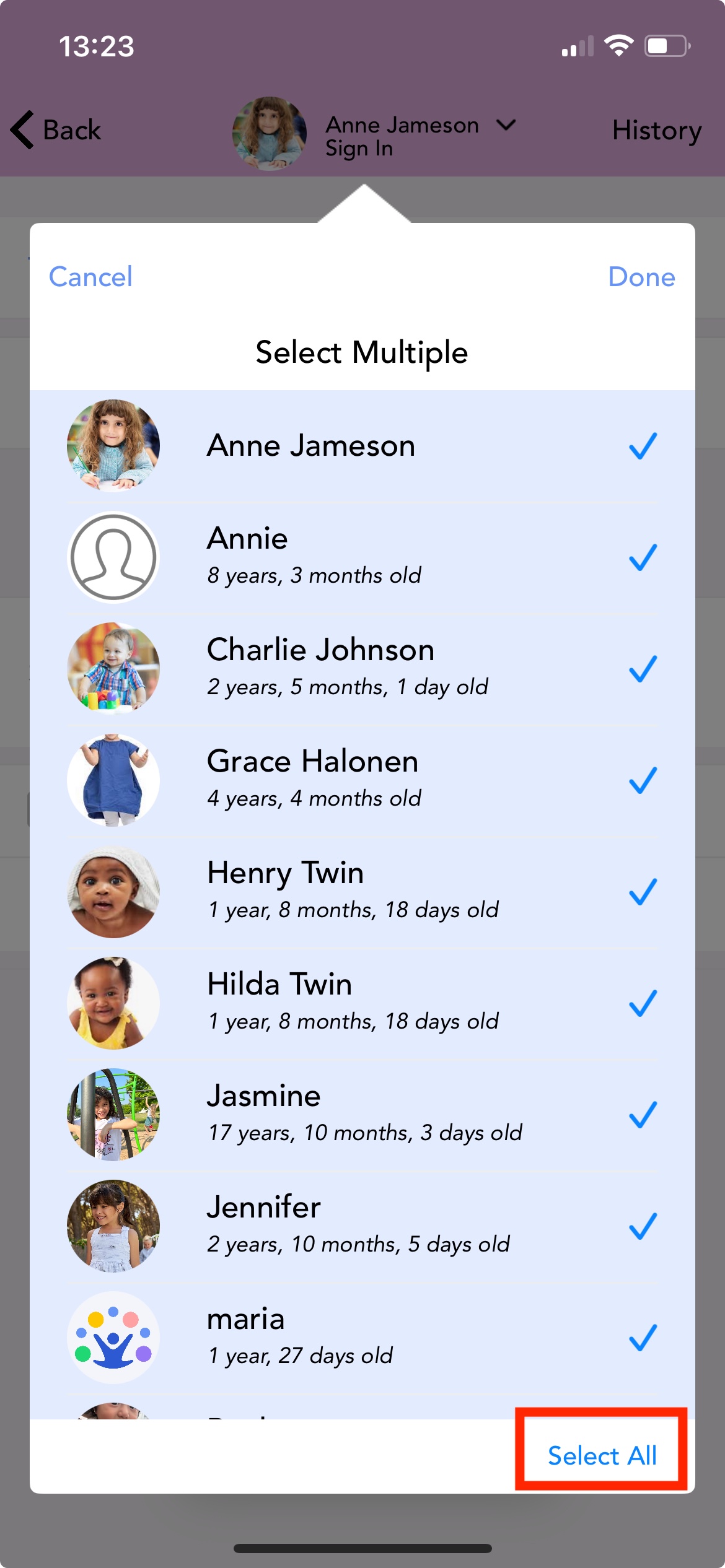 Indicate which child(ren) you are signing in. Select Select All to sign in all children in your classroom at the same time. Then select OK
