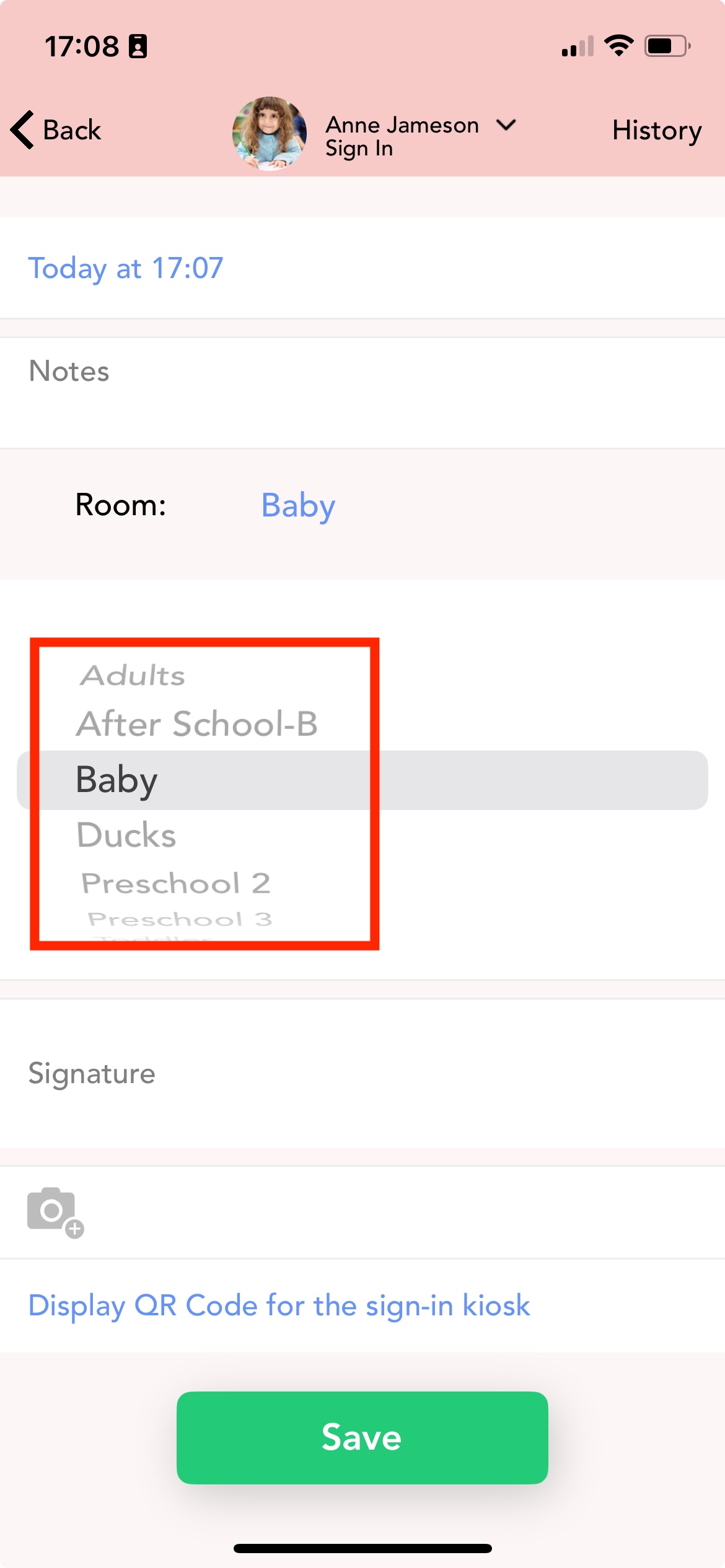 Select the classroom the child is being signed into. The classroom you are currently signed into will be selected by default