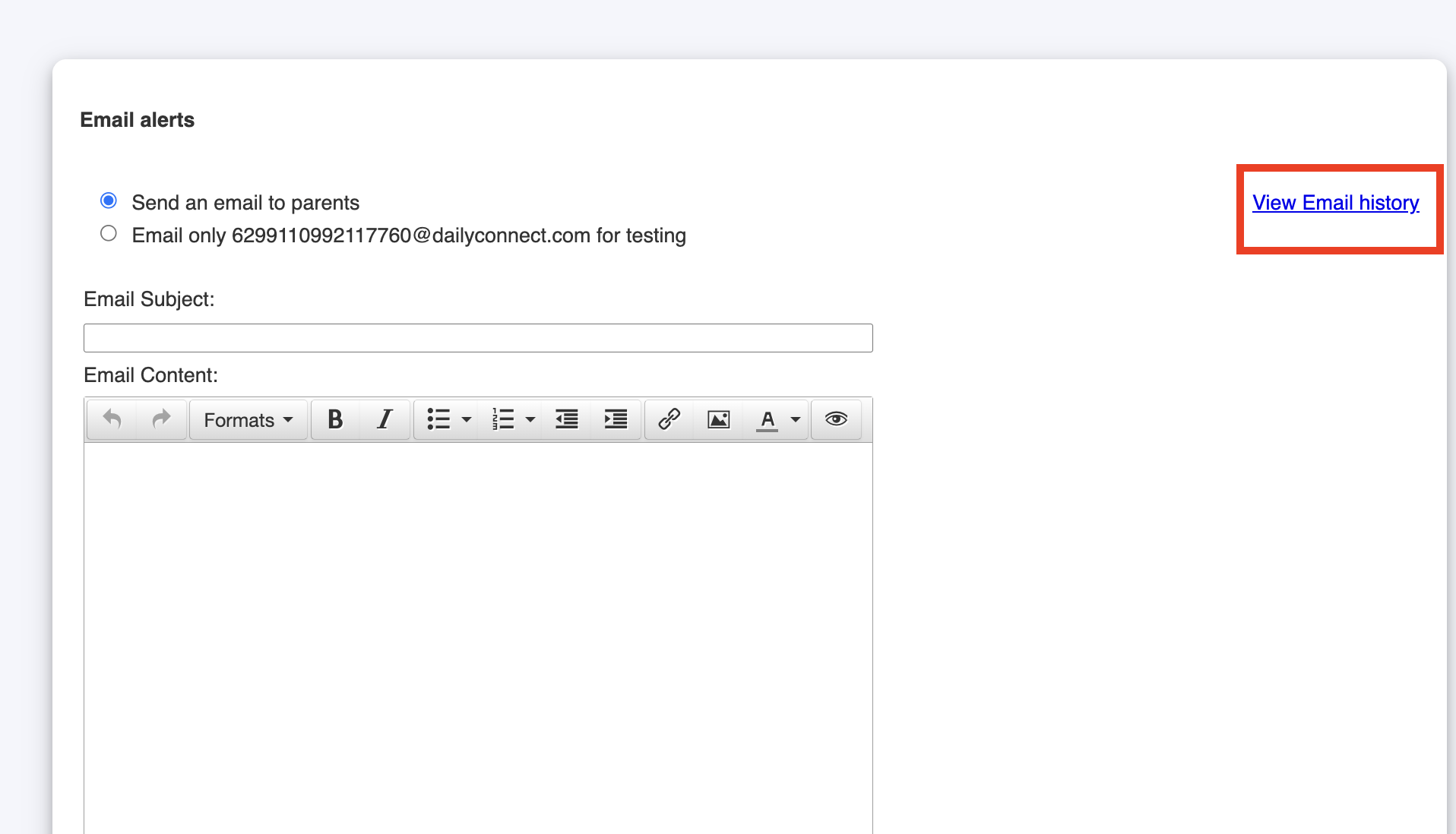 2. If you chose to send an email, enter the email subject, message, recipients (parents of rooms or specific children), attach a file, then select Send.