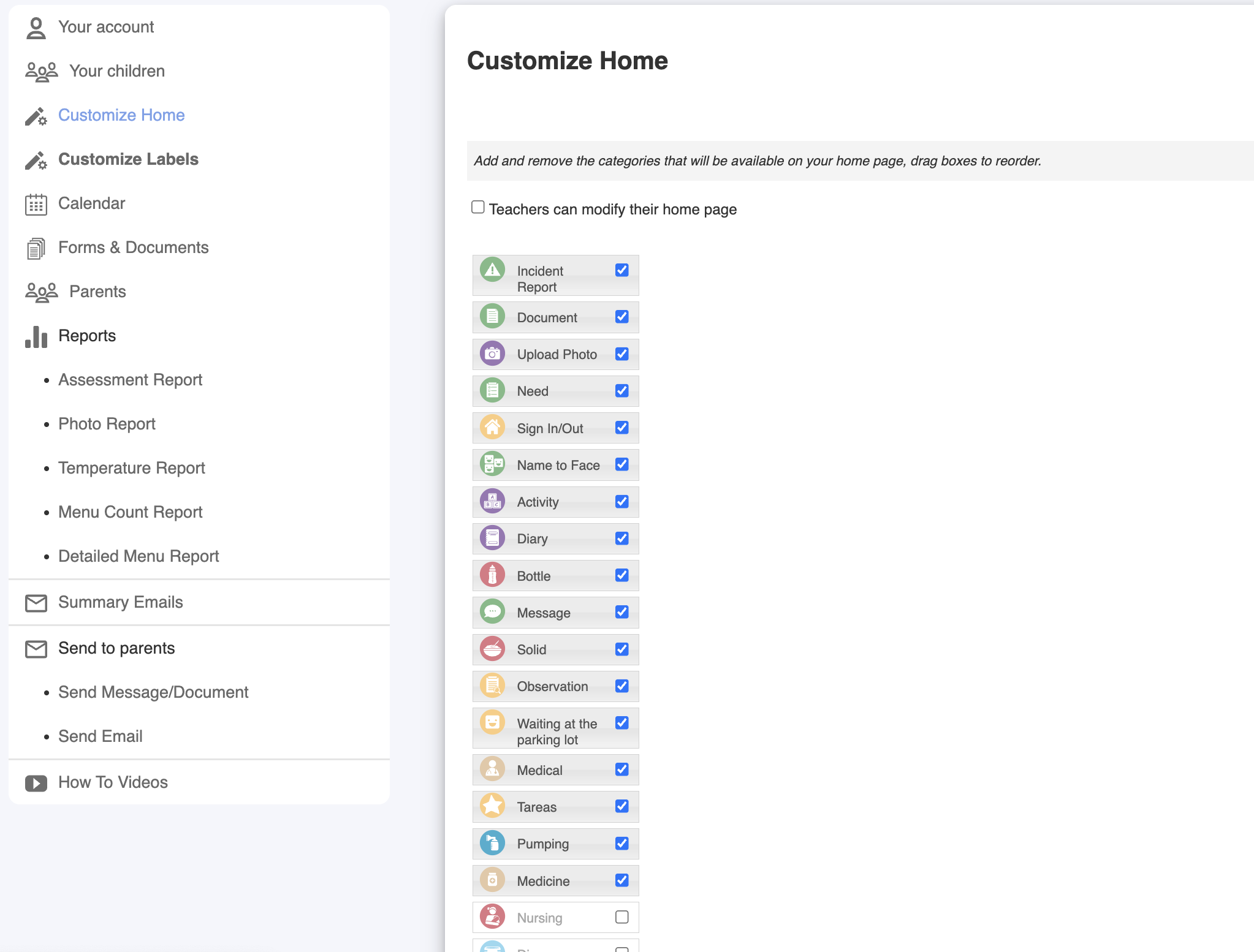By customizing the homepage, you can add, remove and reorder the categories that will be available for each classroom.