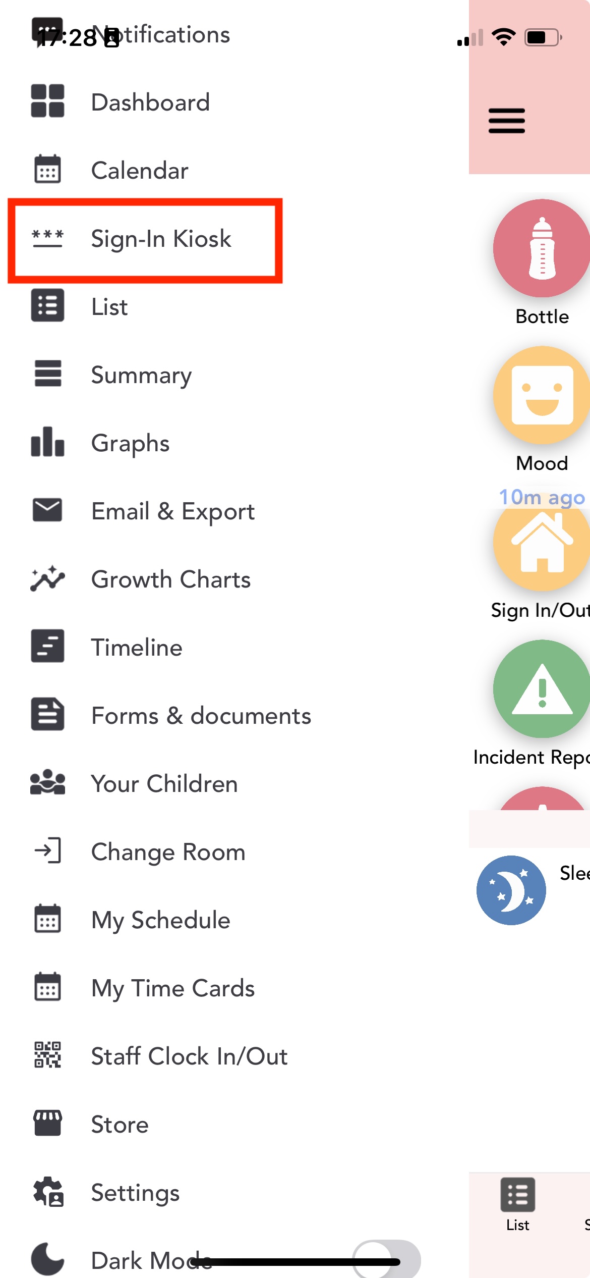 Go to Menu > Sign-in Kiosk on the mobile app.