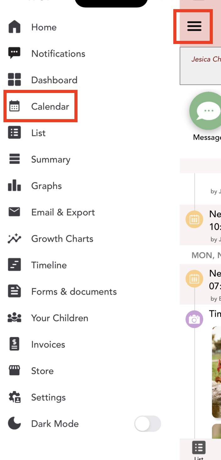 Select the calendar icon to display the calendar or tap the list icon to view a list of all calendar events for the current month.