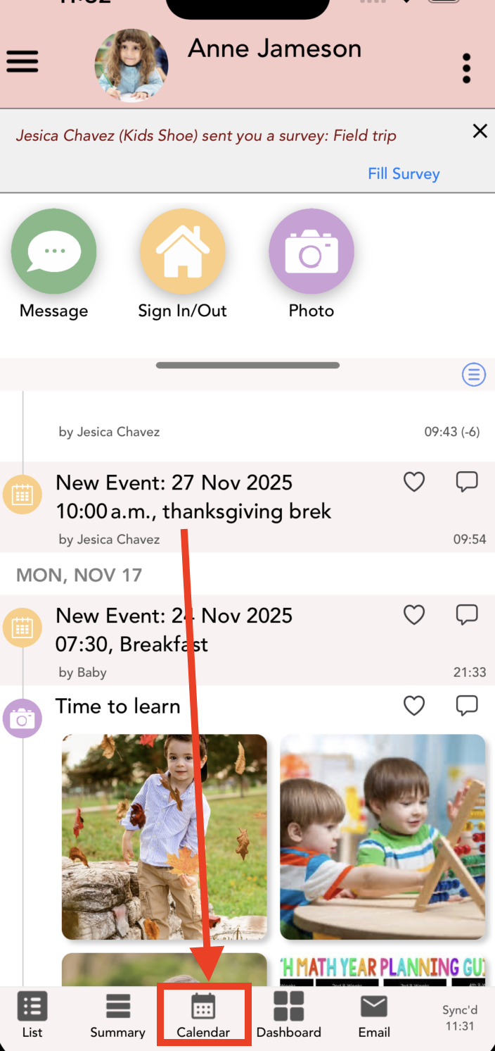 The calendar informs you about upcoming events, food menus, or lessons. Teachers add lessons to the calendar which indicate and describe the different classes they will teach your child on specific dates.