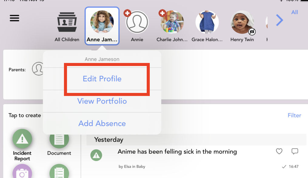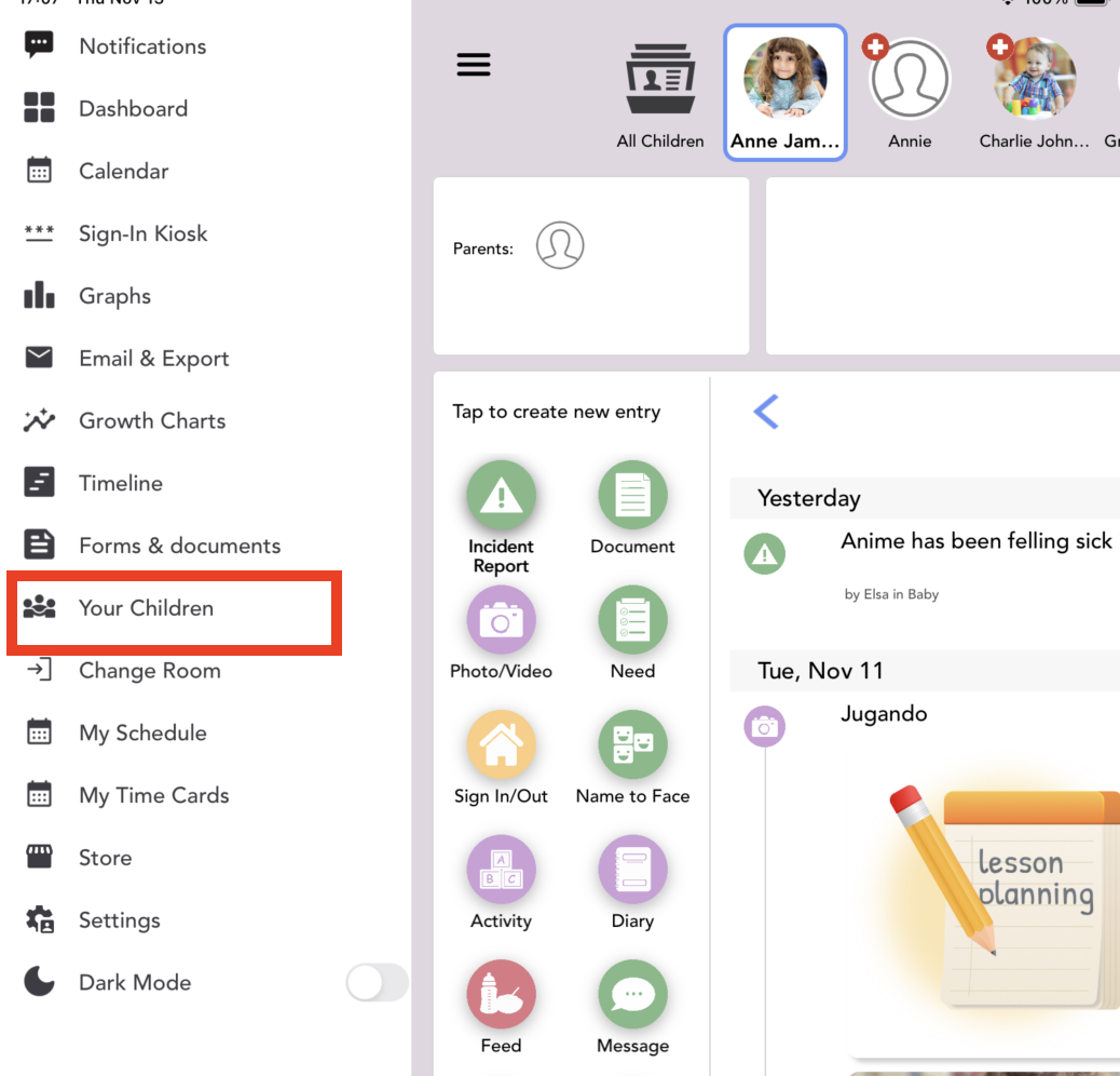 To view the children in your classroom, go to Menu > Your children.