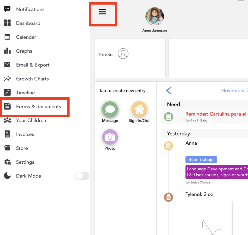 Your child’s care facility may upload forms and documents for you to fill in or contain important information. You can access those forms and documents via your web or mobile app.