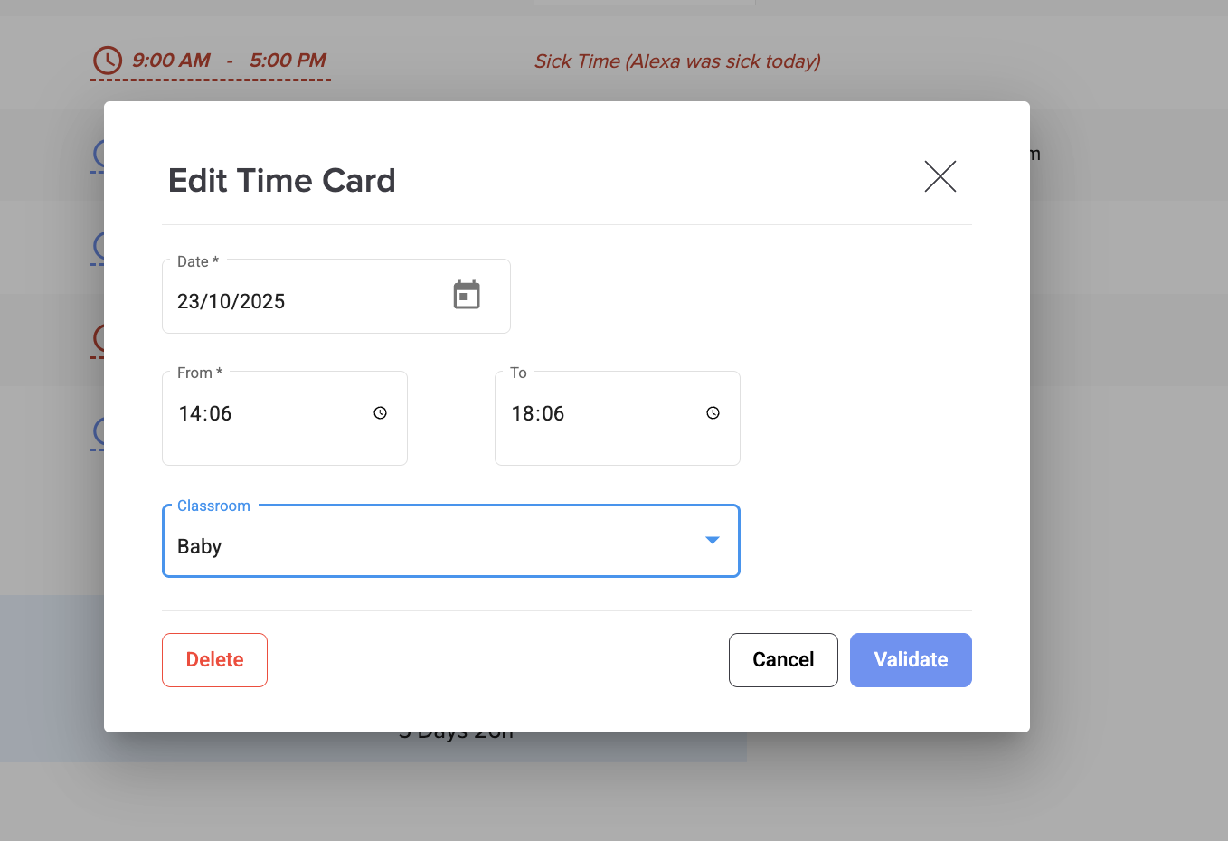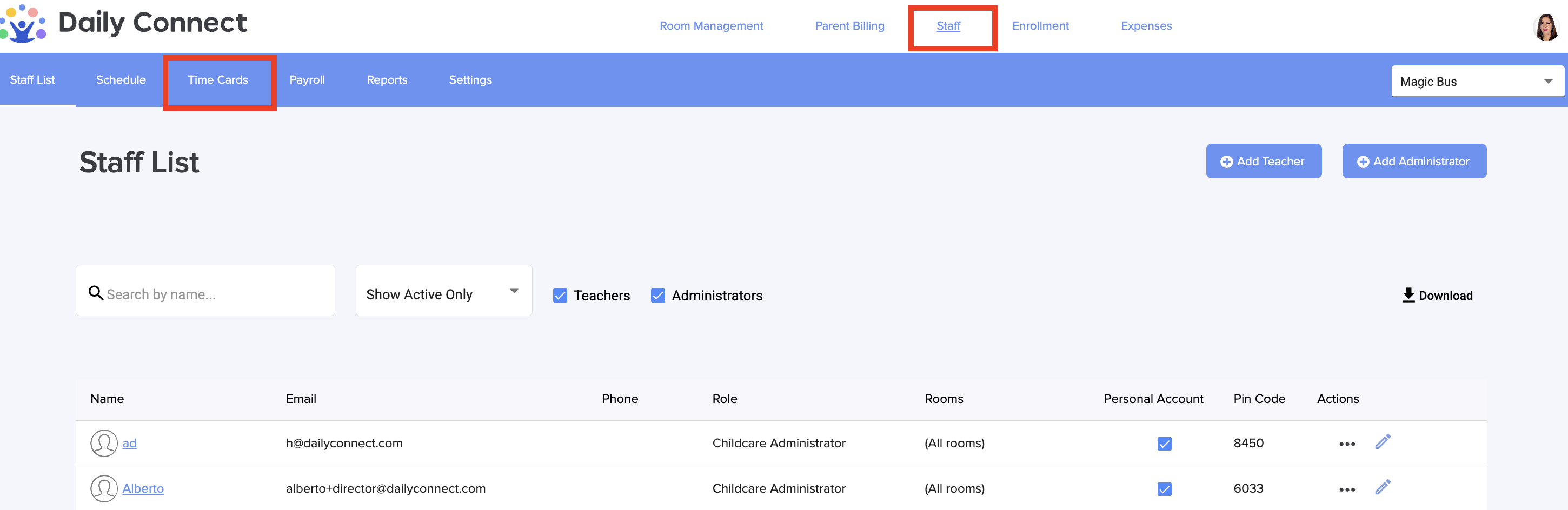 Only administrators can edit time card entries. To edit an entry, go to Staff > Time Cards