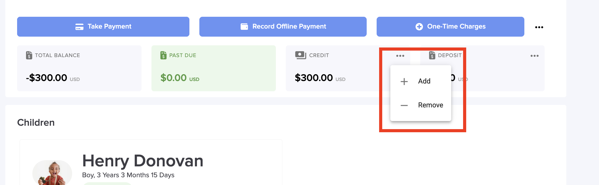 To add a credit go to the Parent Billing > Parents page, click on the name of the parent's name, then click on the '...' and click on "Add".