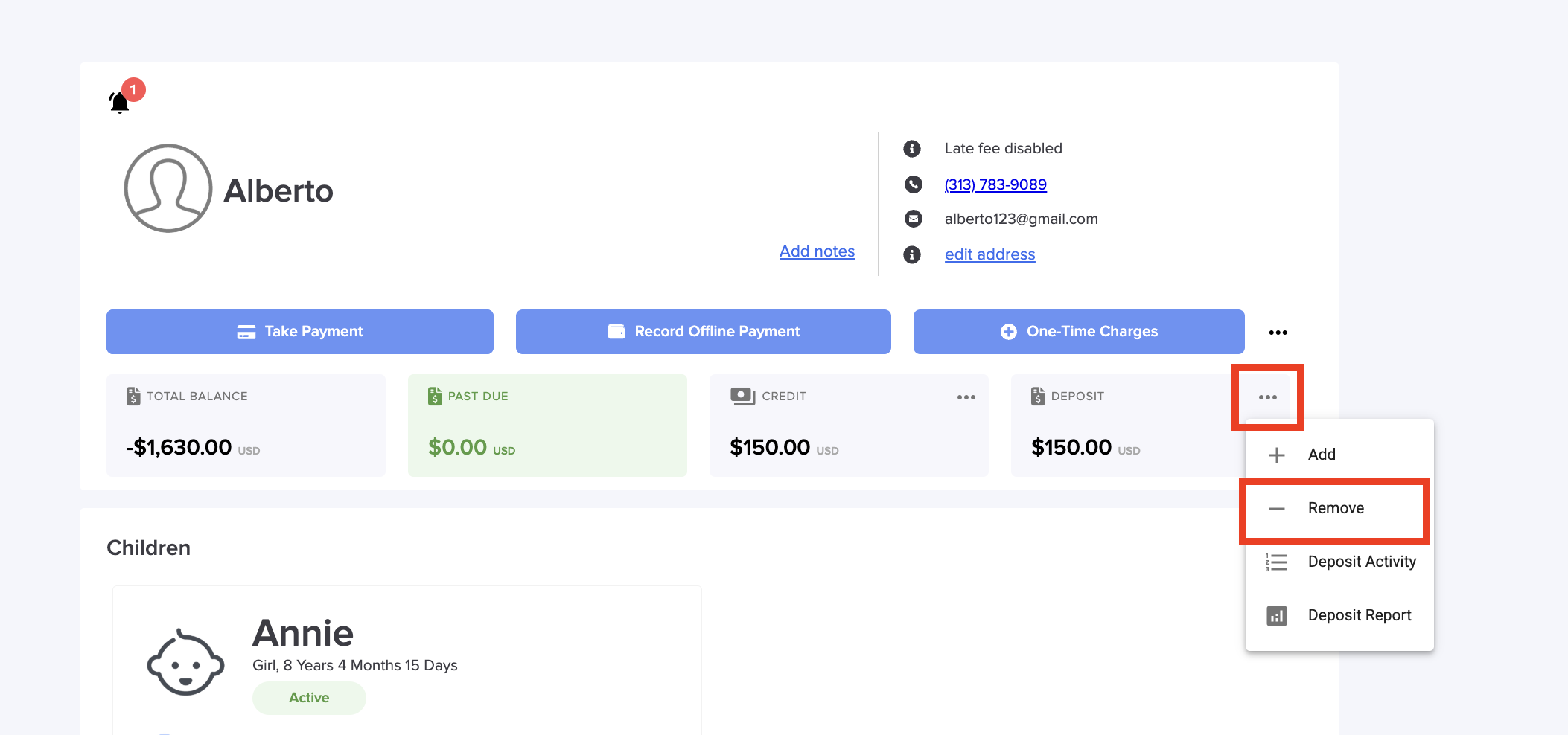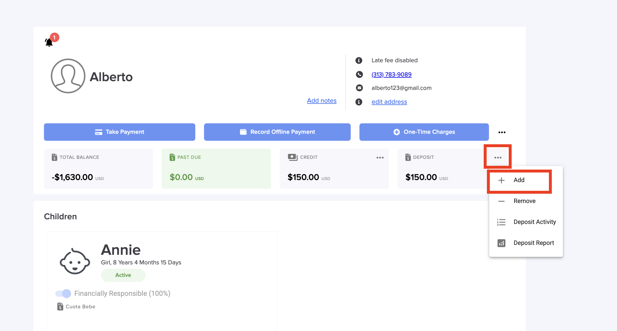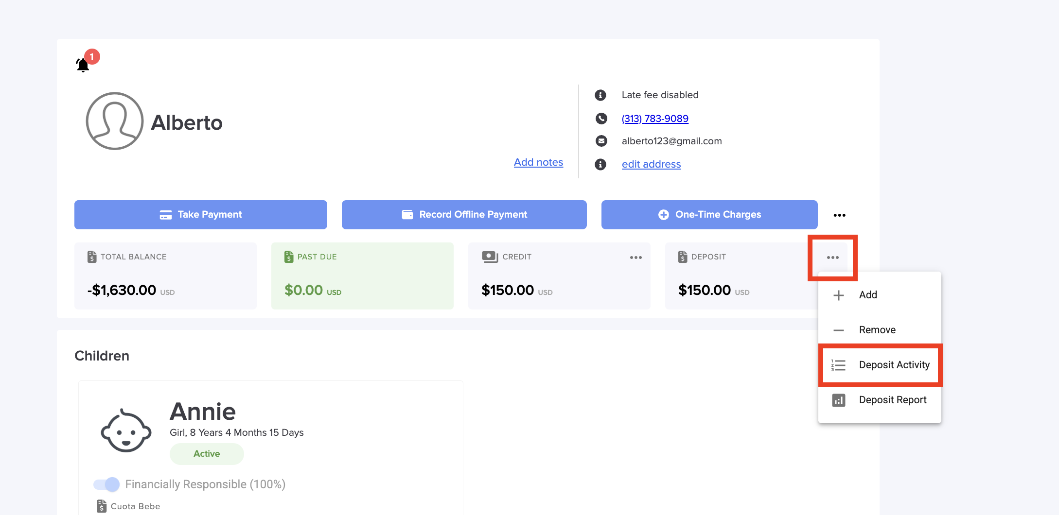 6. You can view the deposit history for this parent by clicking on the three dots and selecting Deposit Activity.