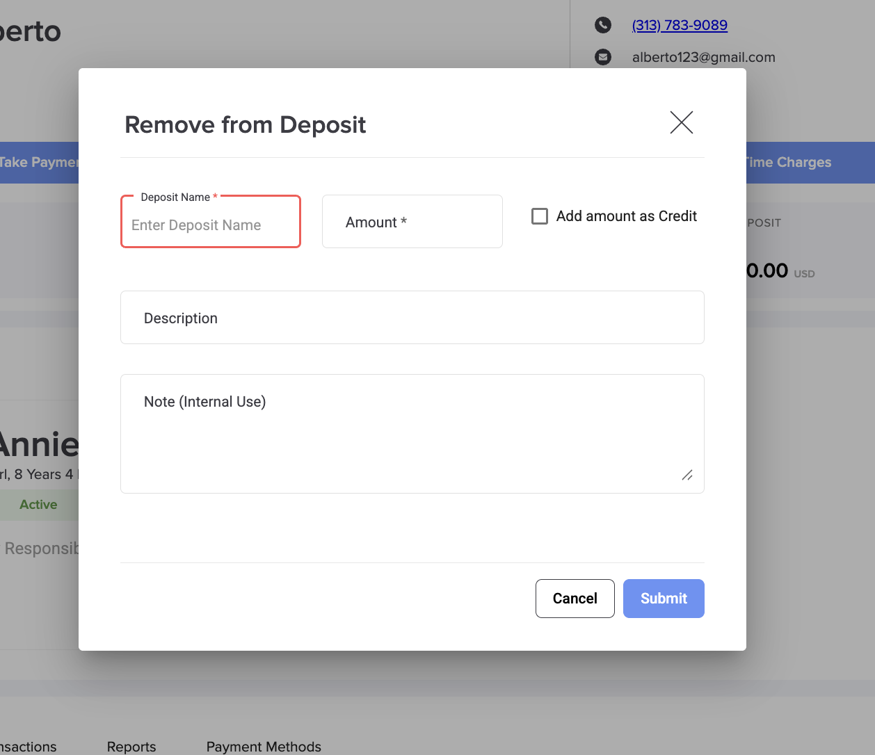 The Deposit feature allows you to track deposits made by parents, enabling you to manage these funds effectively and either utilize them as needed or return them when appropriate