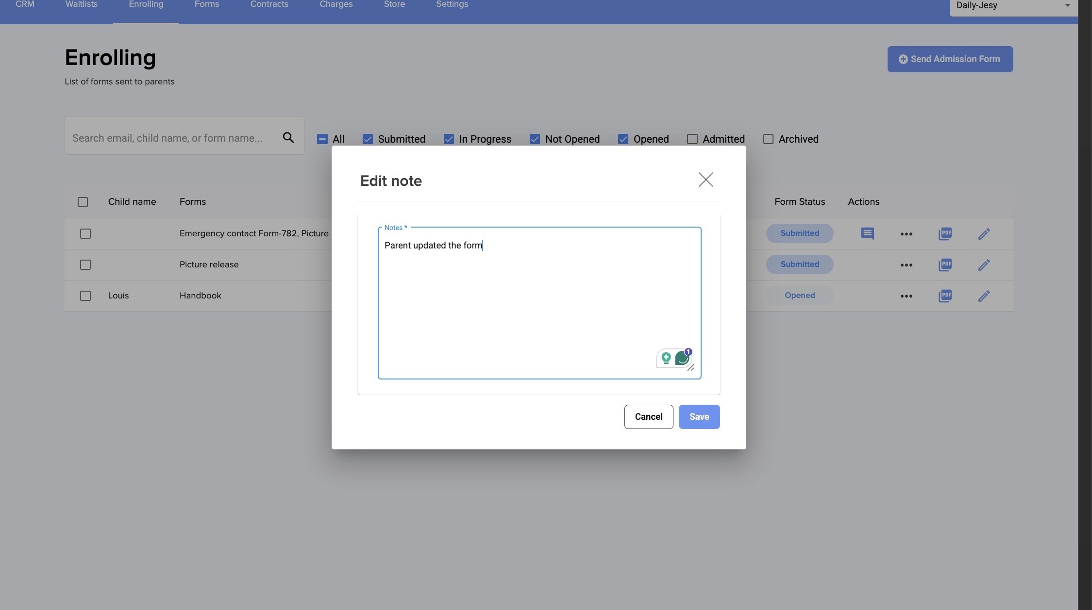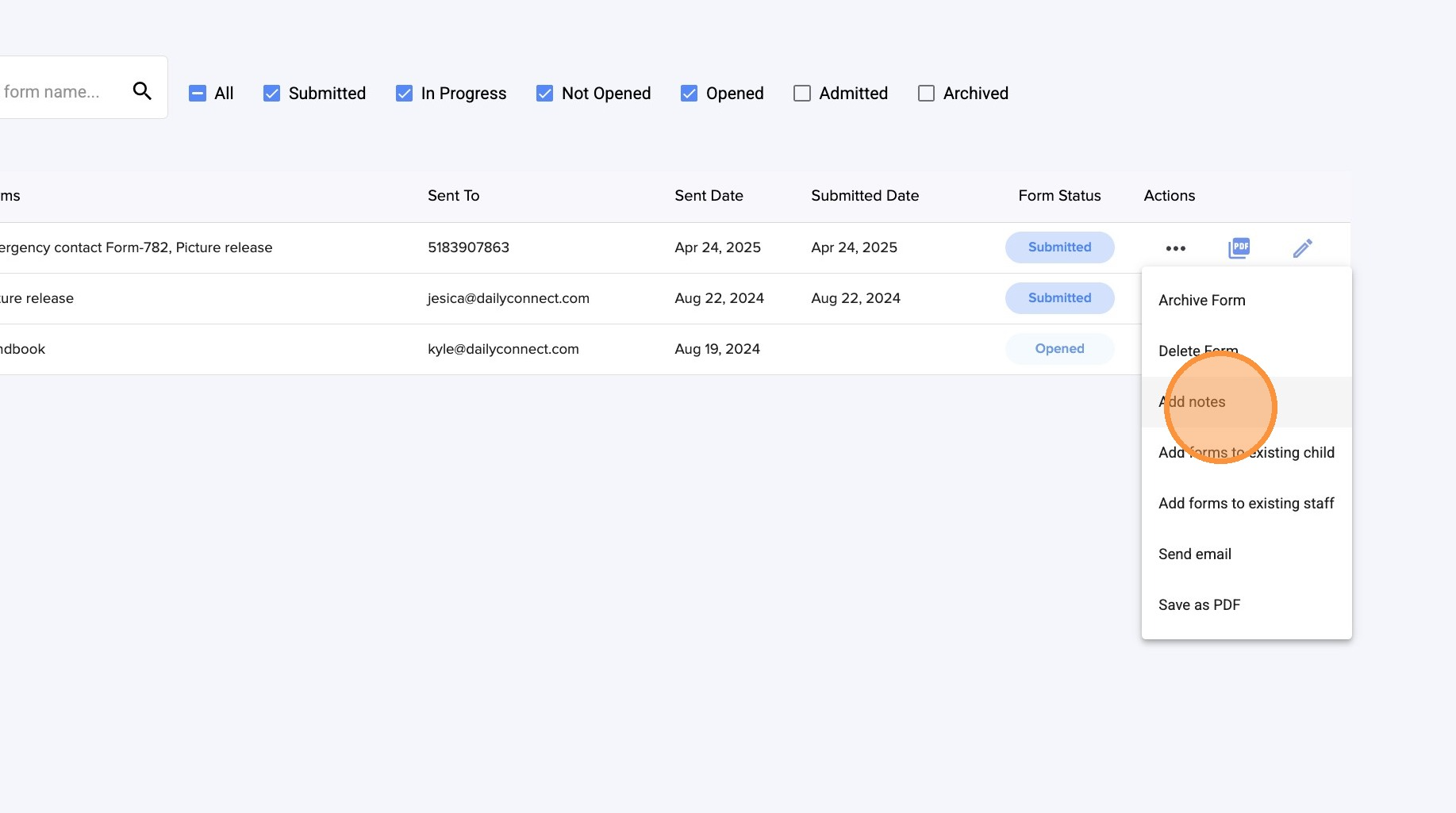 You can now add notes to enrollment forms to track important information. Forms with notes will display a note icon.