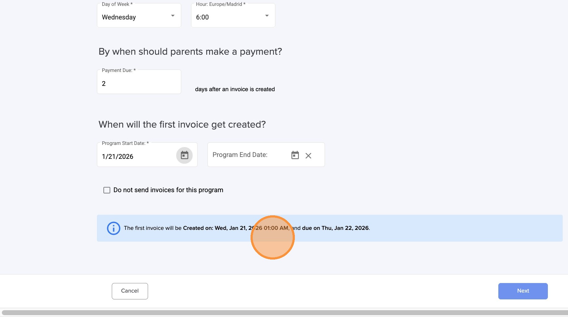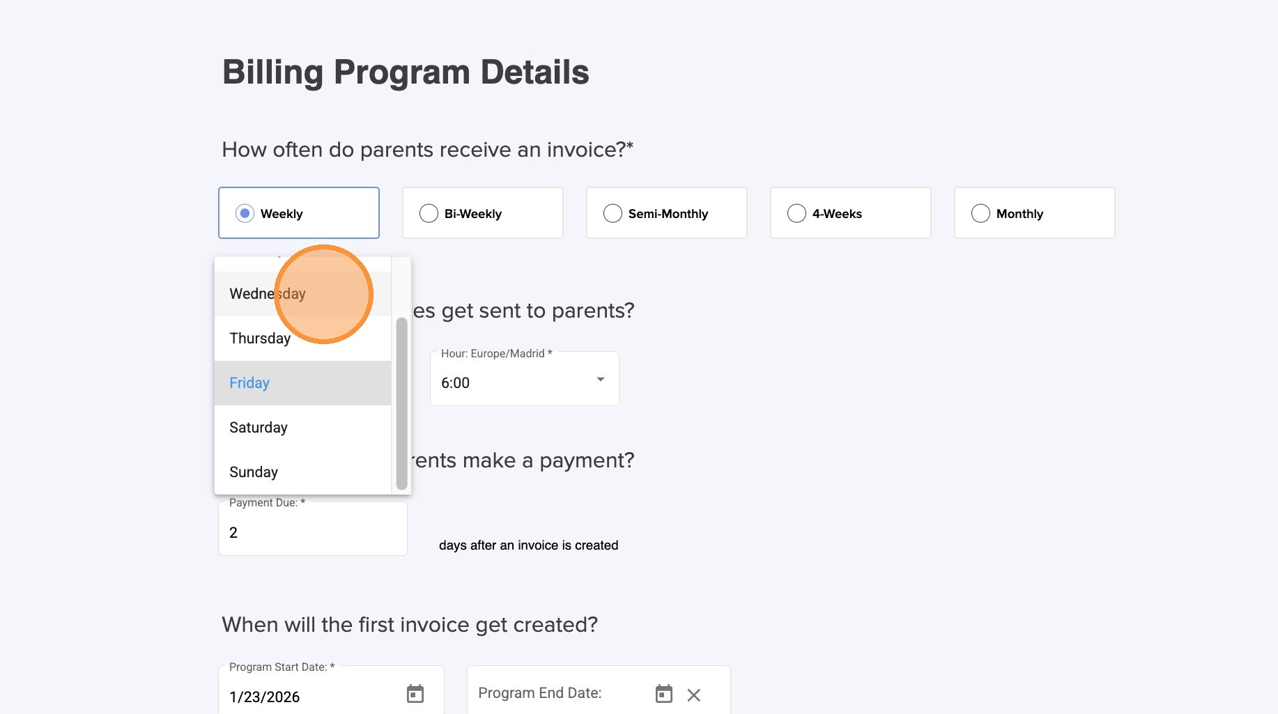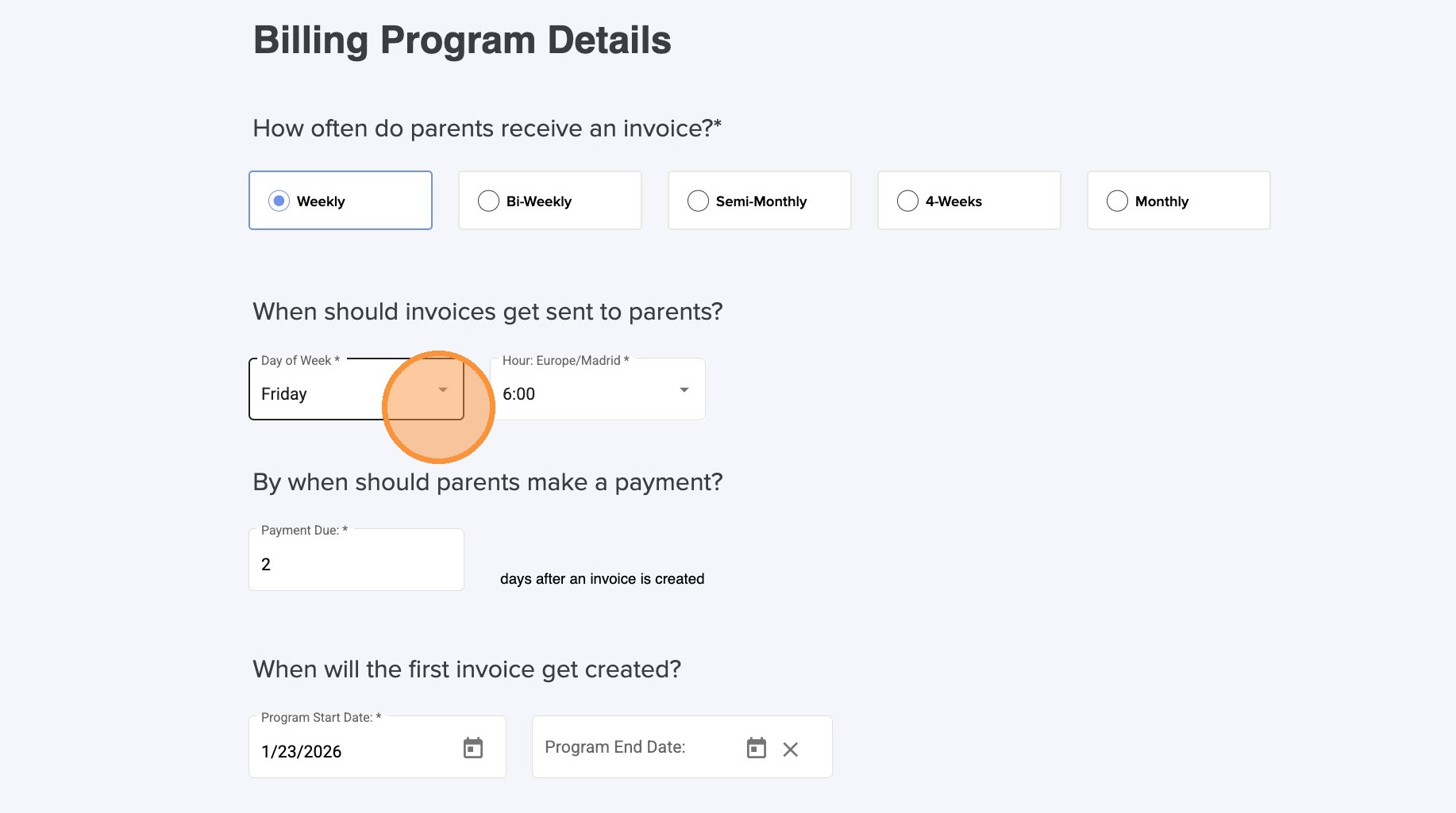 6. In this section, you can customize how and when parents receive invoices. Set the invoice frequency, choose the day of the week or month, select the time the invoice is sent, define the payment due date, and determine when the first invoice will be generated.