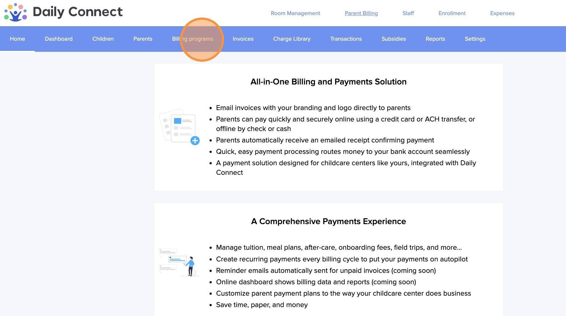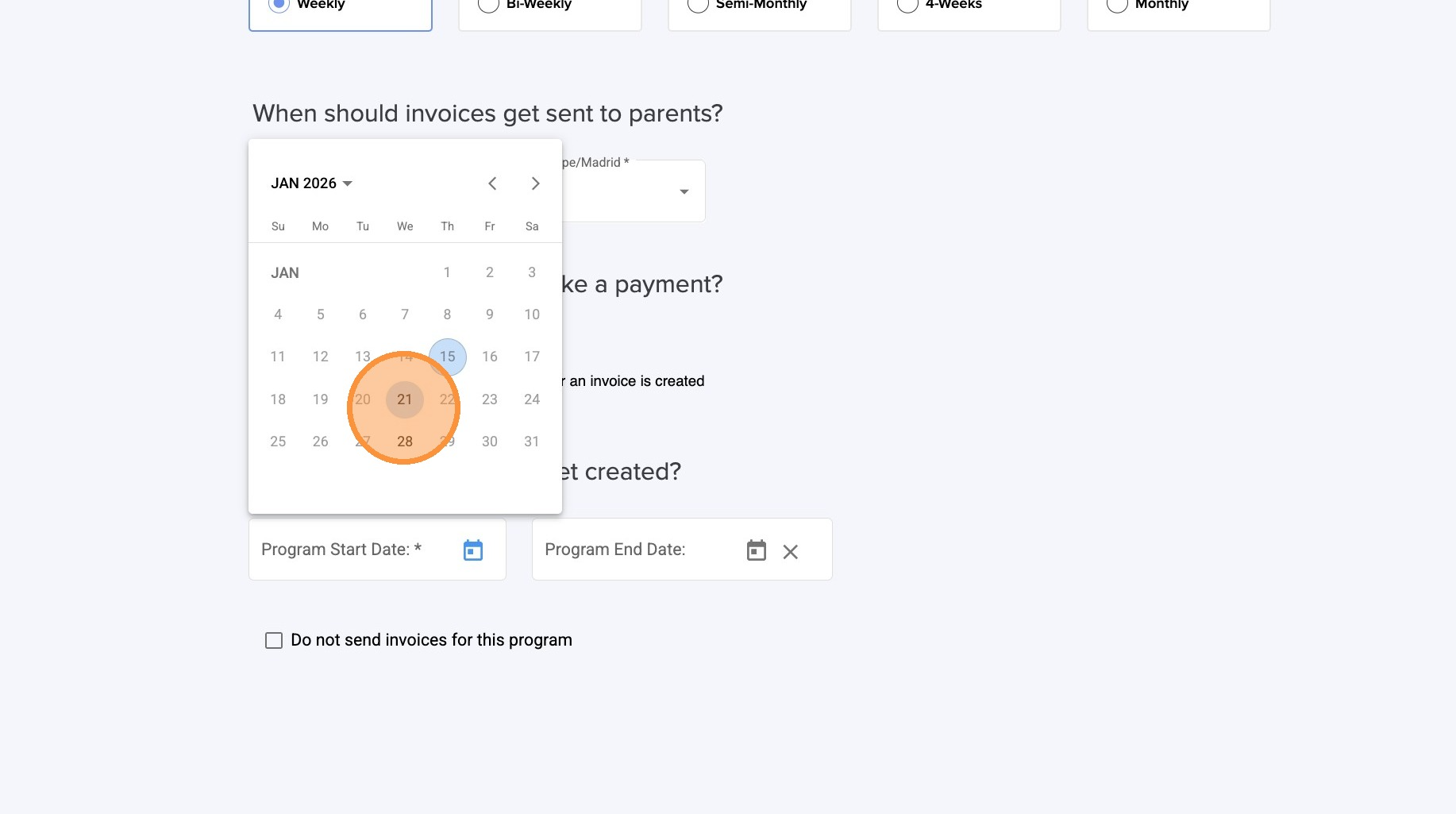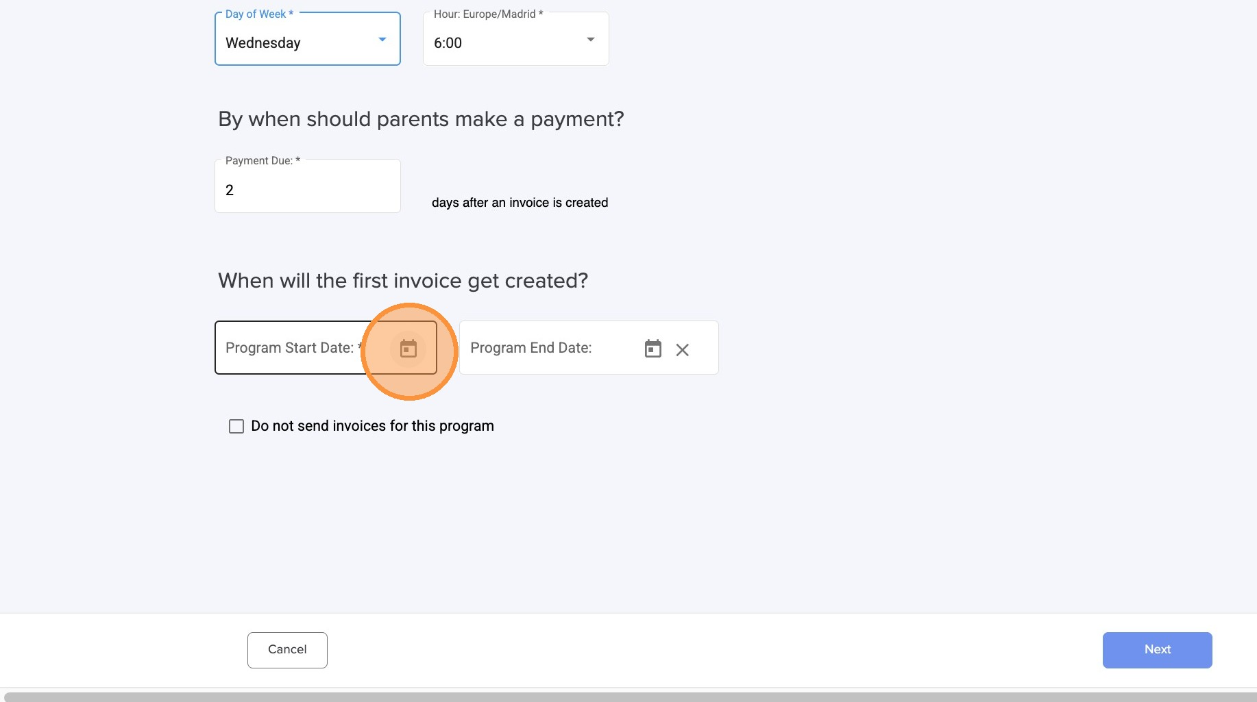 6. In this section, you can customize how and when parents receive invoices. Set the invoice frequency, choose the day of the week or month, select the time the invoice is sent, define the payment due date, and determine when the first invoice will be generated.