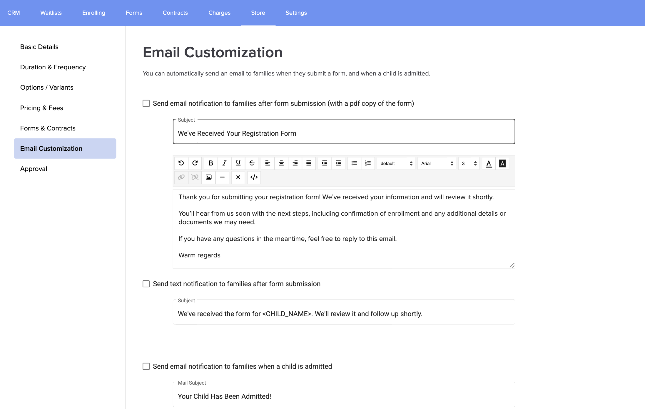 9. In the email customization section, you can customize the emails/SMS that parents will receive (if you want) when they submit the form and/or when the child is admitted: