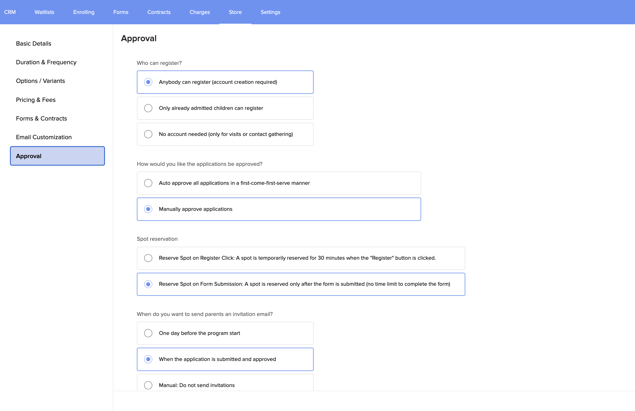10. In this section, you can choose who can submit requests for your services (registered parents or non-registered users), how parents’ requests are approved, and other important settings to manage your products.