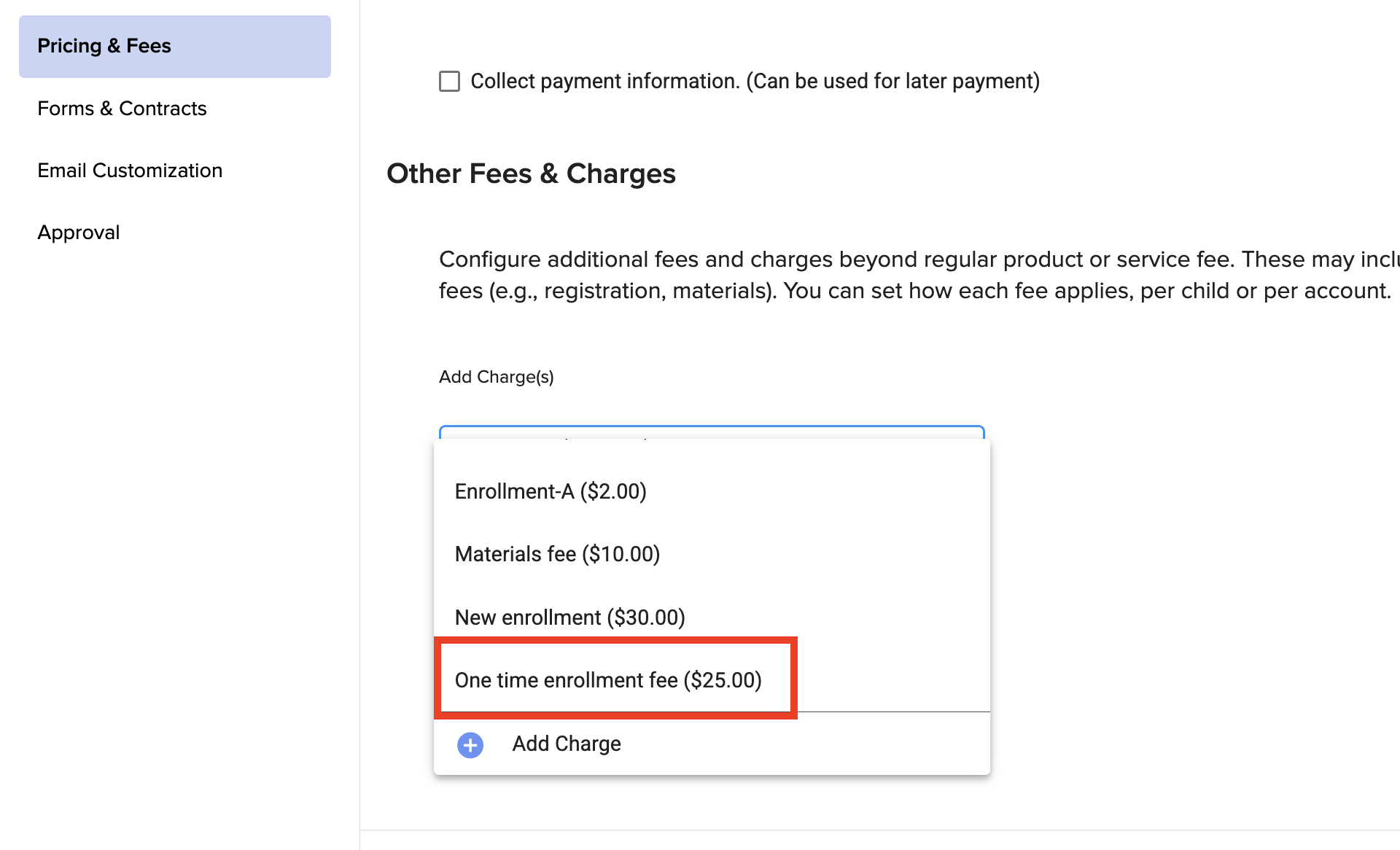 3. Select the one time-enrollment fee that you have created before in the Charges section.