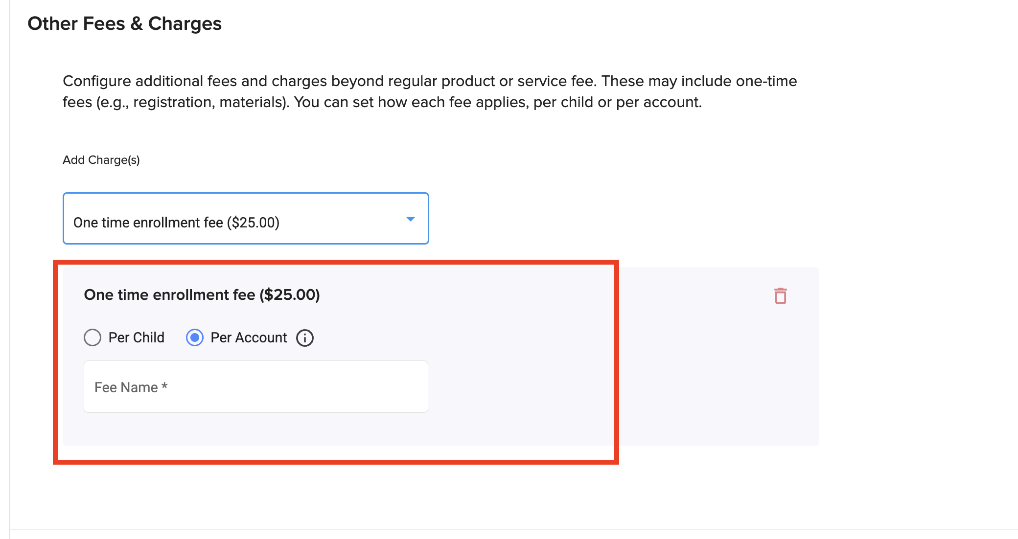 4. Here you can choose whether the charge will be applied per child (one charge for each child) or per account (a single charge per account regardless of the number of children). You can also give the charge a name.