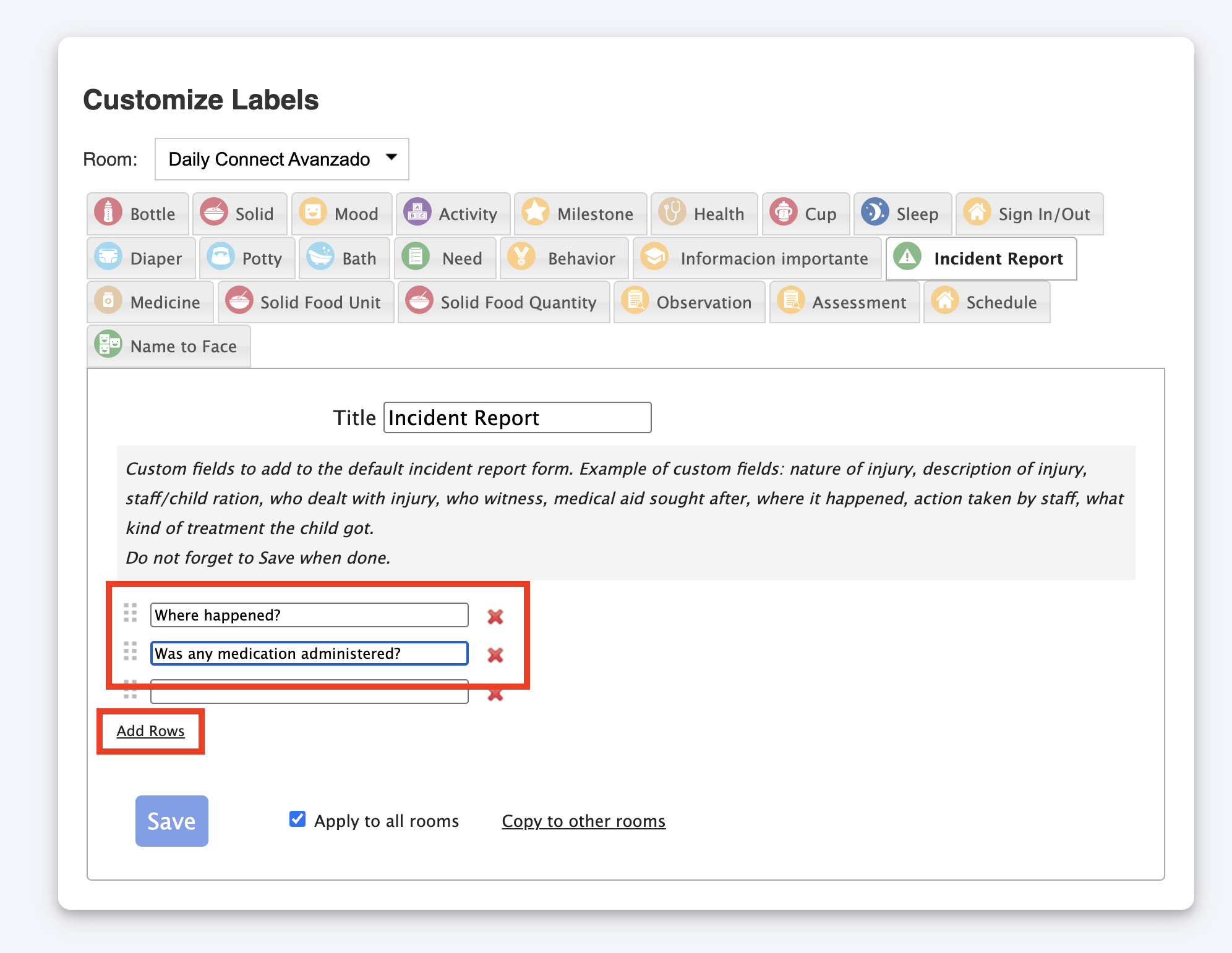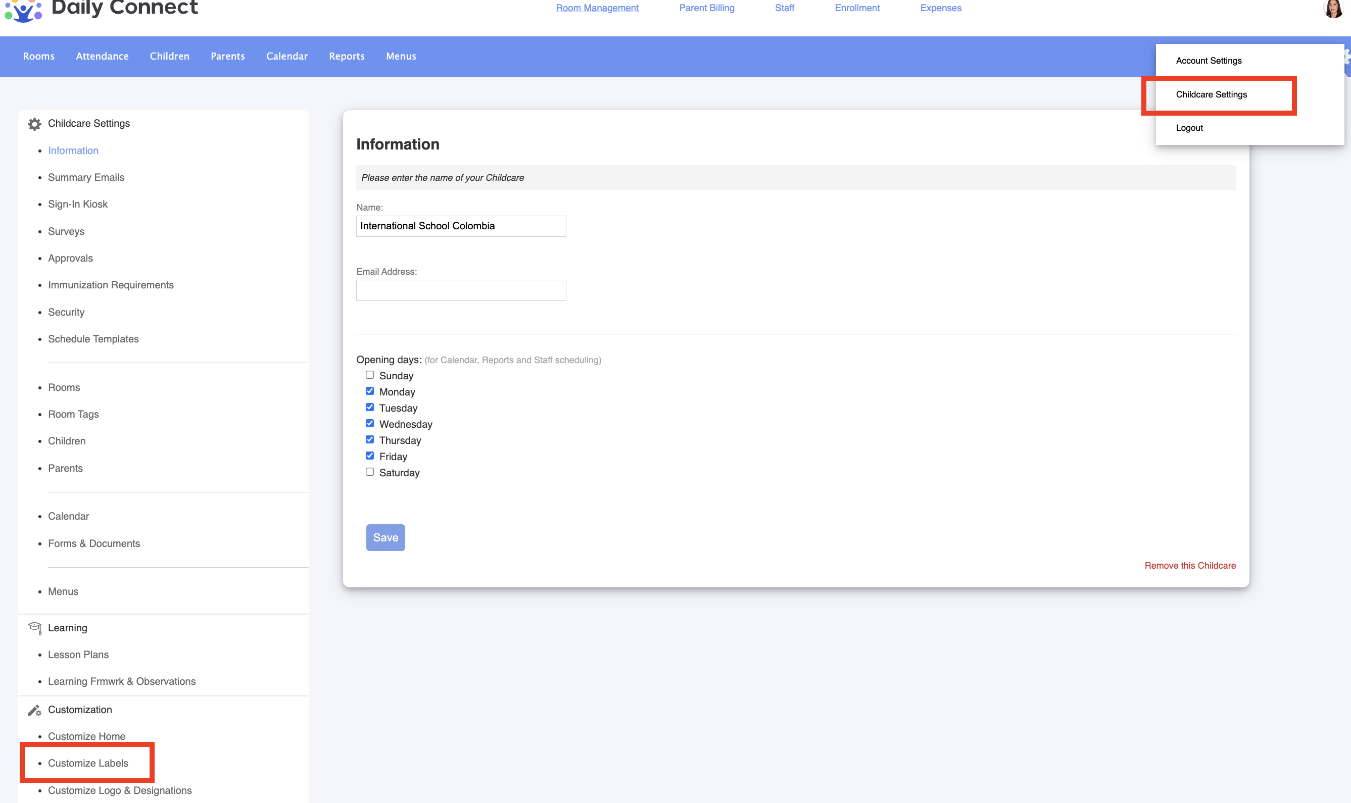 2. Go to Childcare settings > Customize labels: