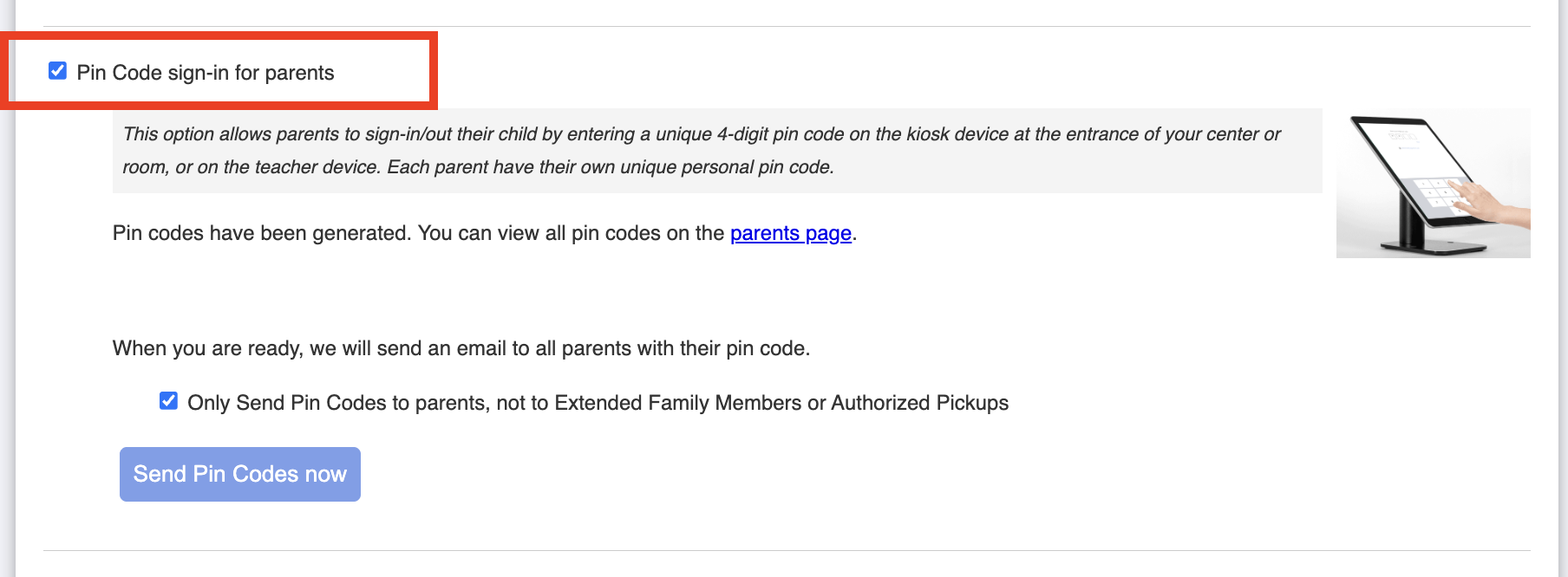 You can also enable the option to send the pin code to parents only.