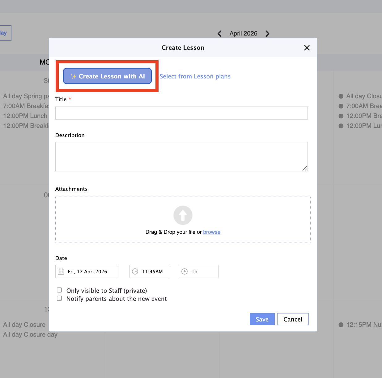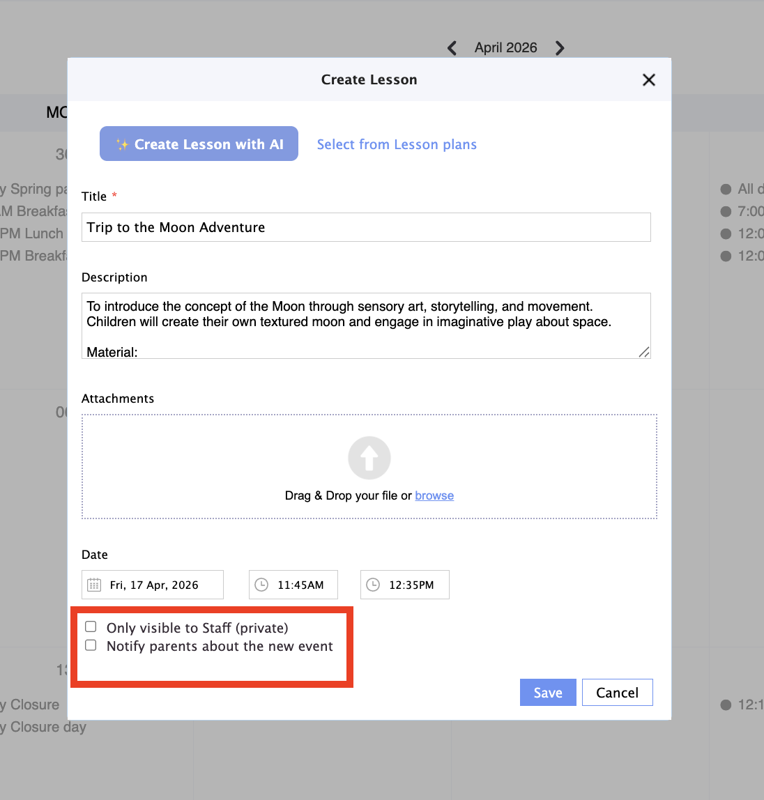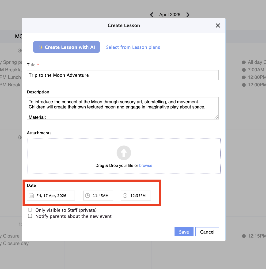 8. Select the day and time when this lesson is scheduled. If you want you can also upluad documents to the lesson calendar entry: