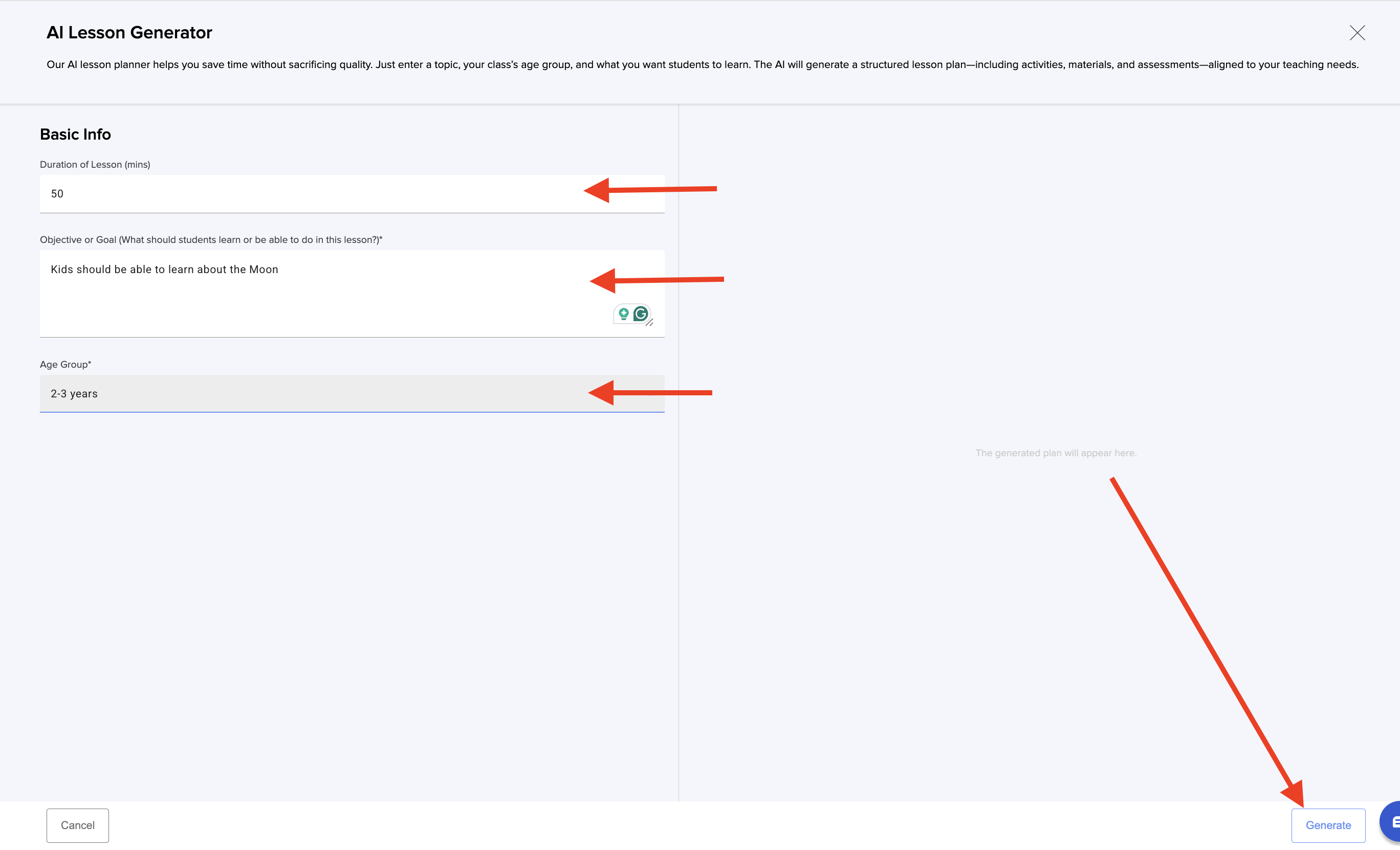 6. Fill in all the information requested: duration, goals and age group. Click Generate: