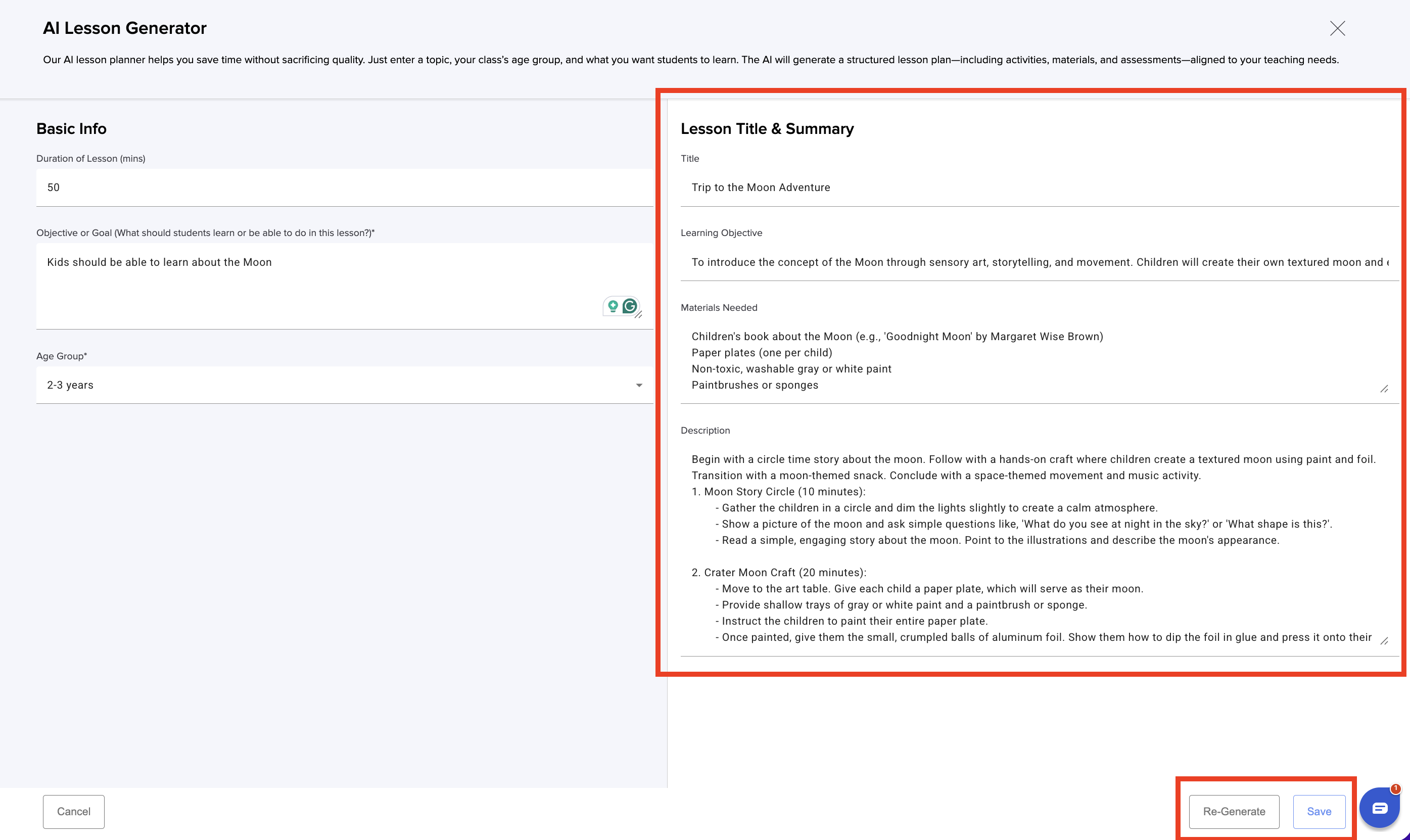 7. Review the lesson generated and click Save. If you want another version click Re-generate: