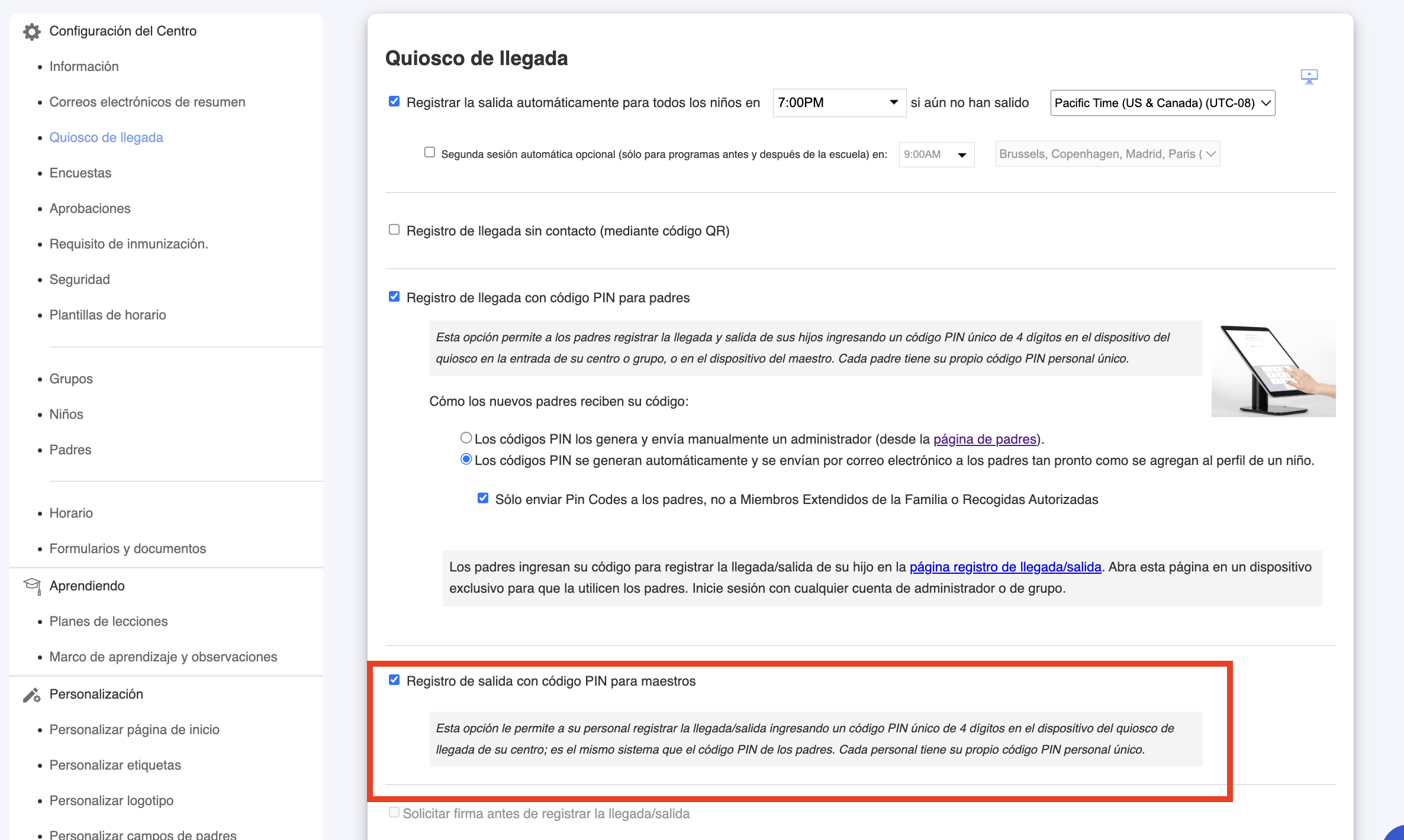 Cuando se utiliza el quiosco de llegada, el personal también puede registrar su entrada/salida con un código PIN o con la opción de registro sin contacto. La opción “Registro de entrada/salida con código PIN para maestros” debe estar activada en Configuración del centro > Quiosco de llegada.