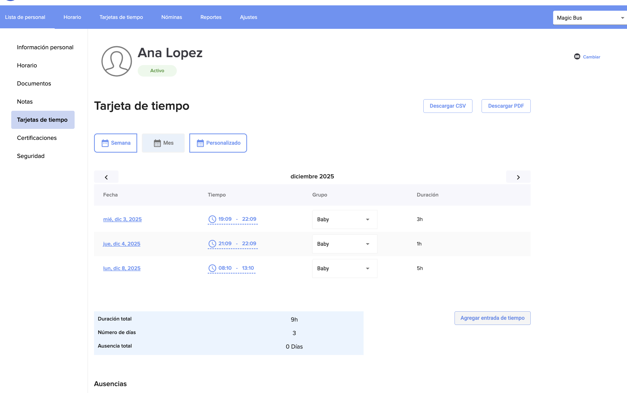 El informe de asistencia diario / semanal / mensual, accesible en la página Informes > Tarjeta de tiempo (educadores), muestra la información de los docentes después de seleccionar al docente en el menú desplegable de Grupo.