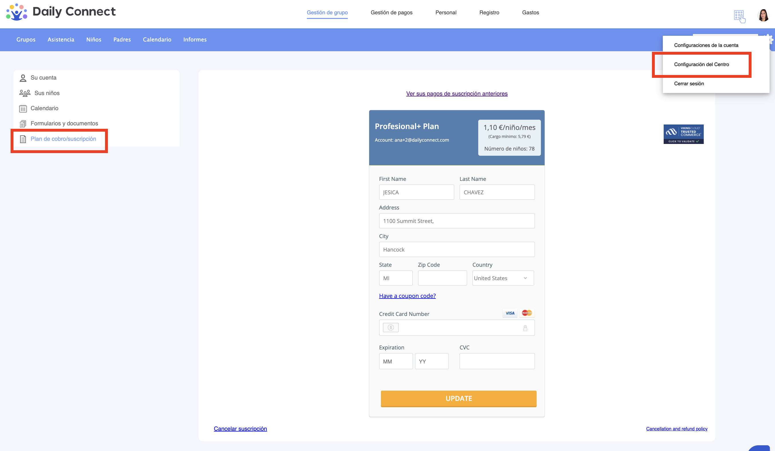 Inicia sesión en la aplicación web y ve a  Configuración de la cuenta > Plan de cobro/Suscripción (luego modifica los datos que consideres).