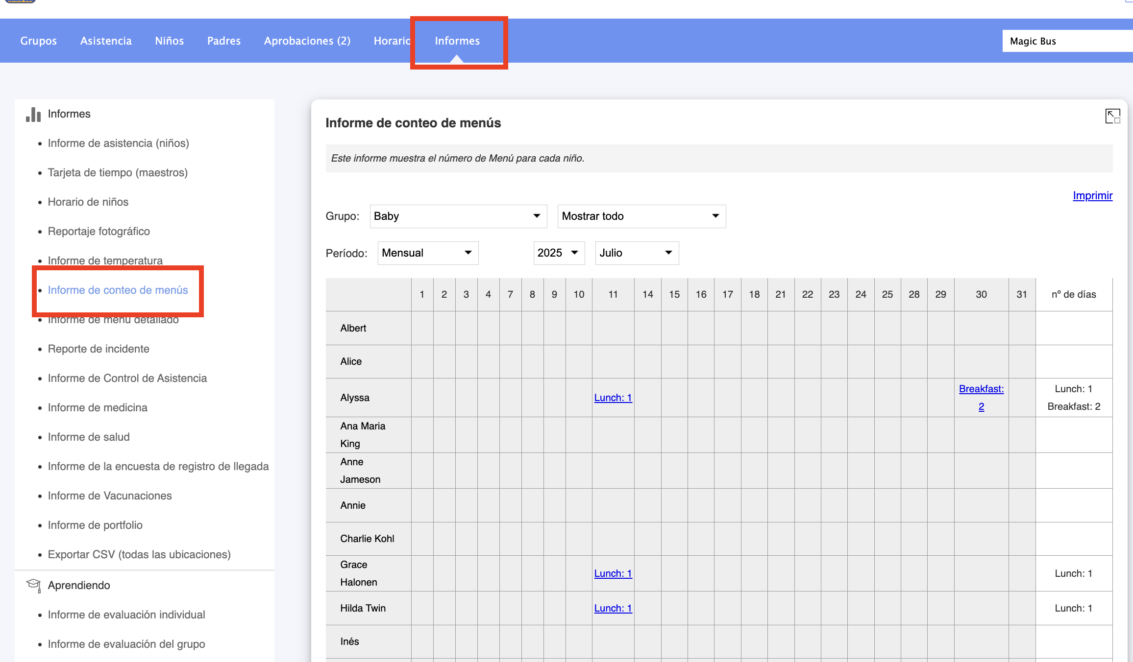 Los reportes de menú están disponibles en la página Configuración > Informes > Informes de conteo de Menú. Allí se muestra el número de refrigerios / desayunos / almuerzos servidos para cada niño y cada grupo.