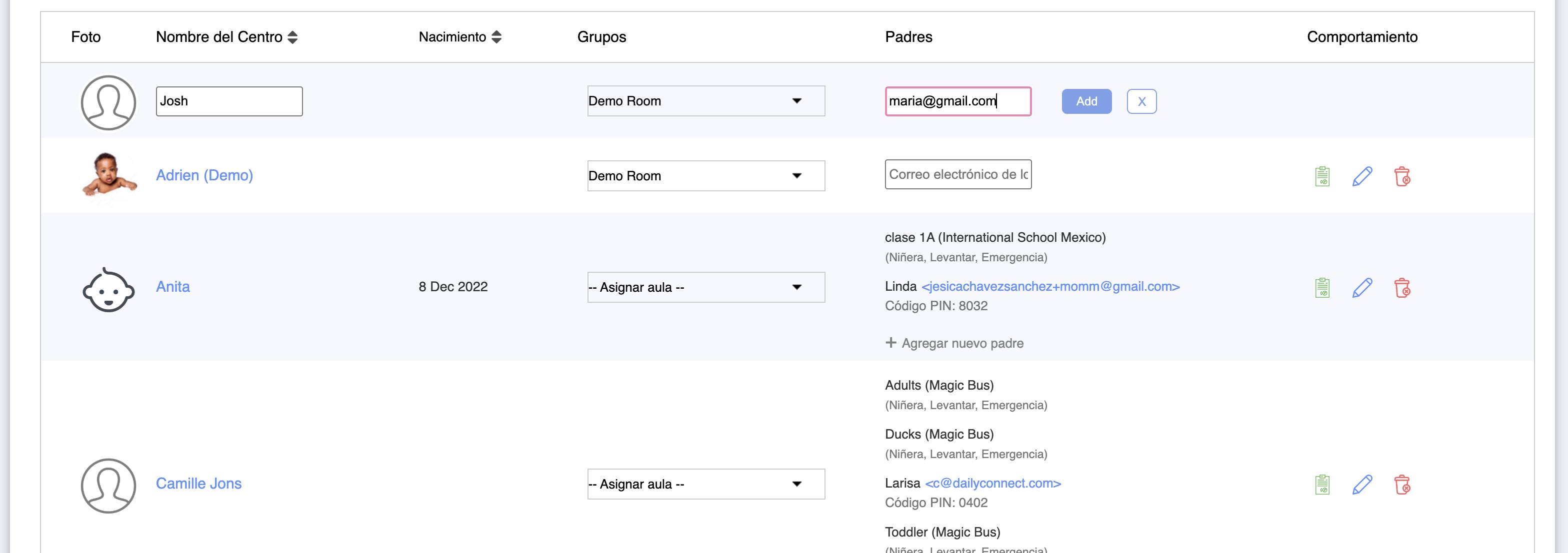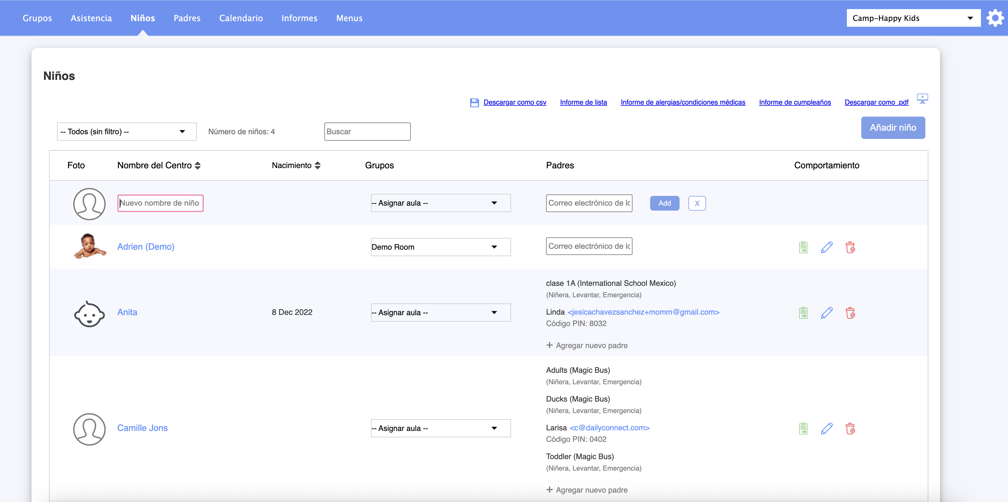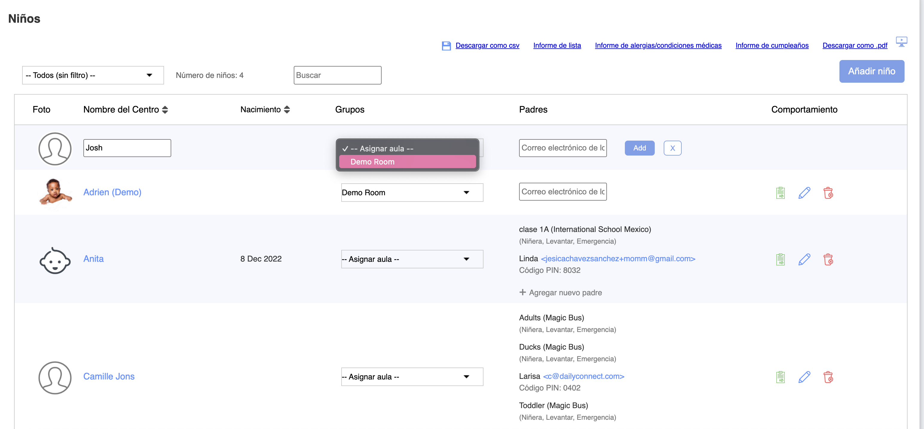 Esta opción es útil durante la configuración inicial del sistema, ya que permite al administrador crear los perfiles de todos los niños, ingresar las direcciones de correo electrónico de los padres y enviar las invitaciones en una etapa posterior. Además, hay un ícono "Invitar a todos los padres" en la parte superior, que puede utilizarse después de cargar la lista de niños.