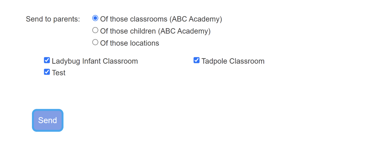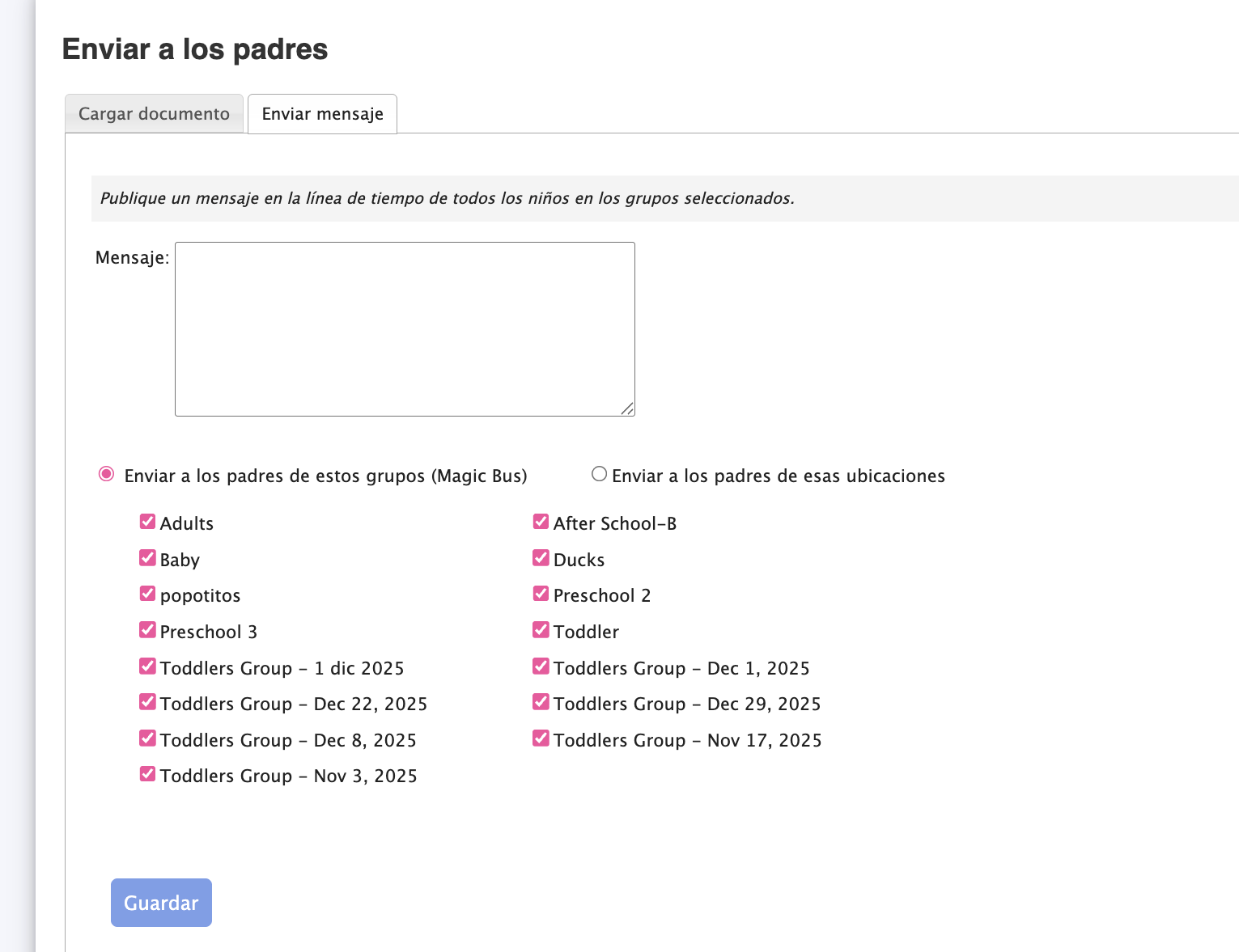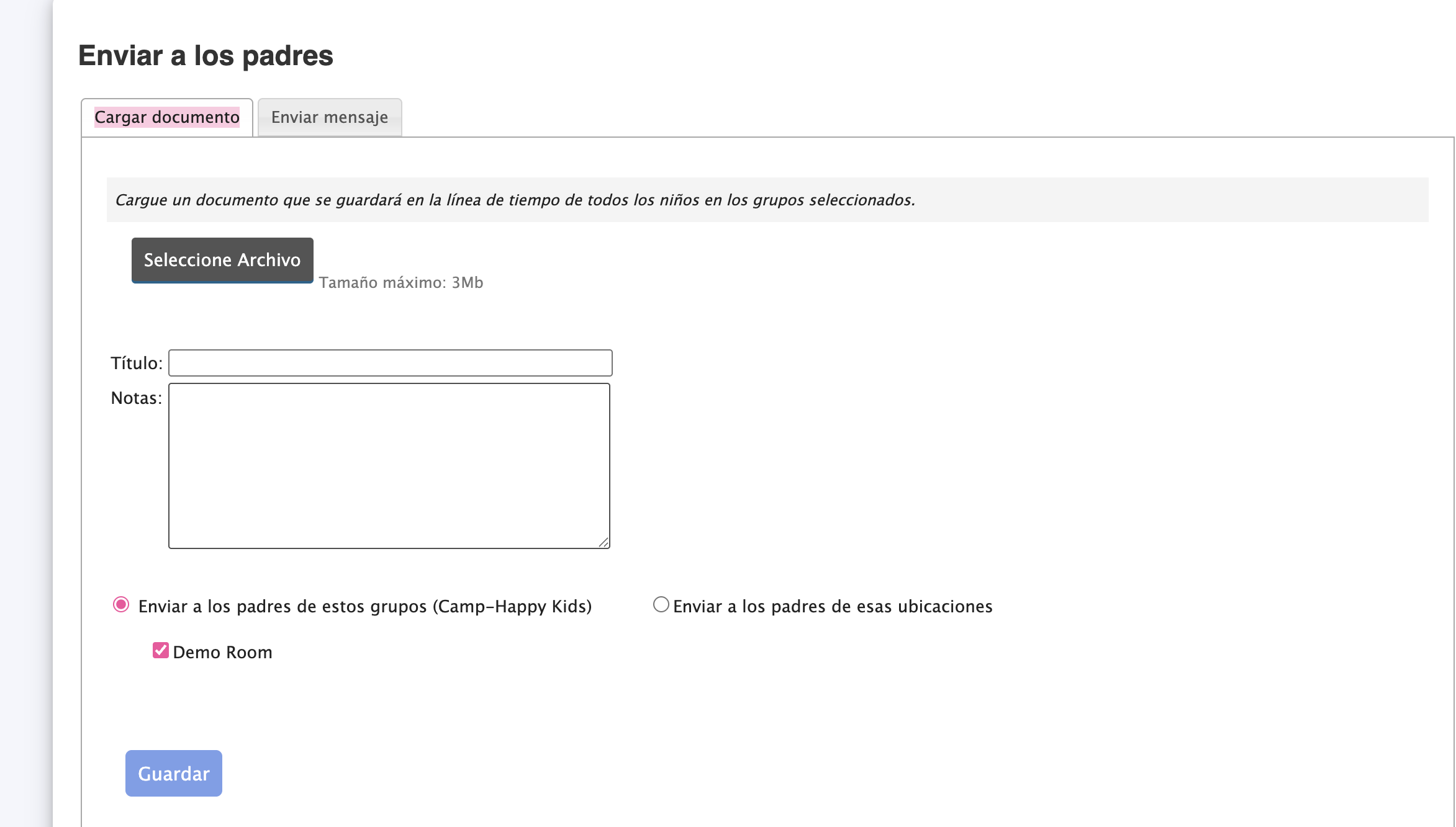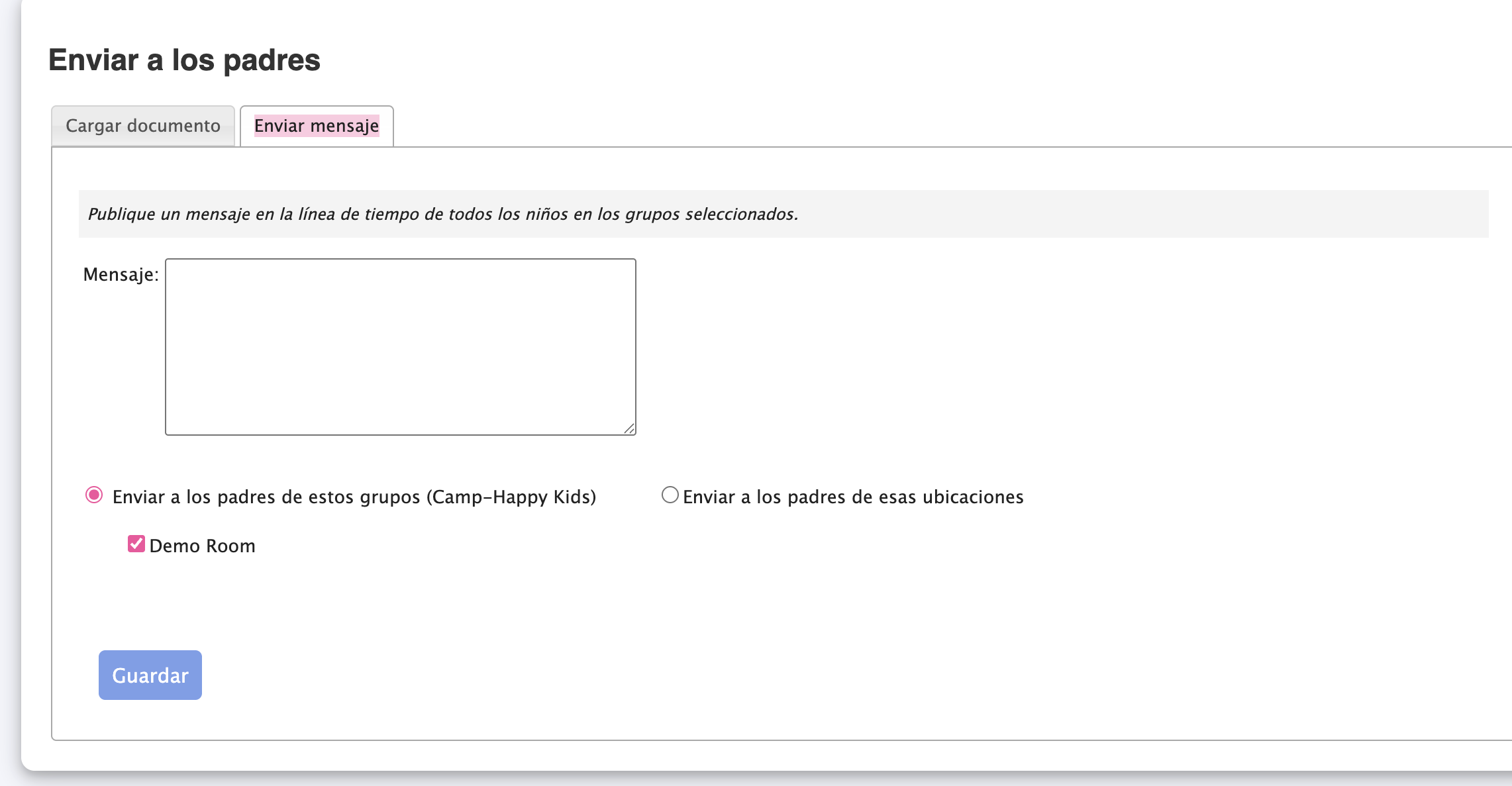 La función Enviar a los padres, disponible en la página de Configuración de Guardería, te permite comunicarte directamente con los padres de los niños inscritos en tu centro. Puedes subir un documento o publicar un mensaje en la línea de tiempo de todos los niños de las salas seleccionadas. También puedes enviar correos electrónicos o mensajes de texto a los padres.