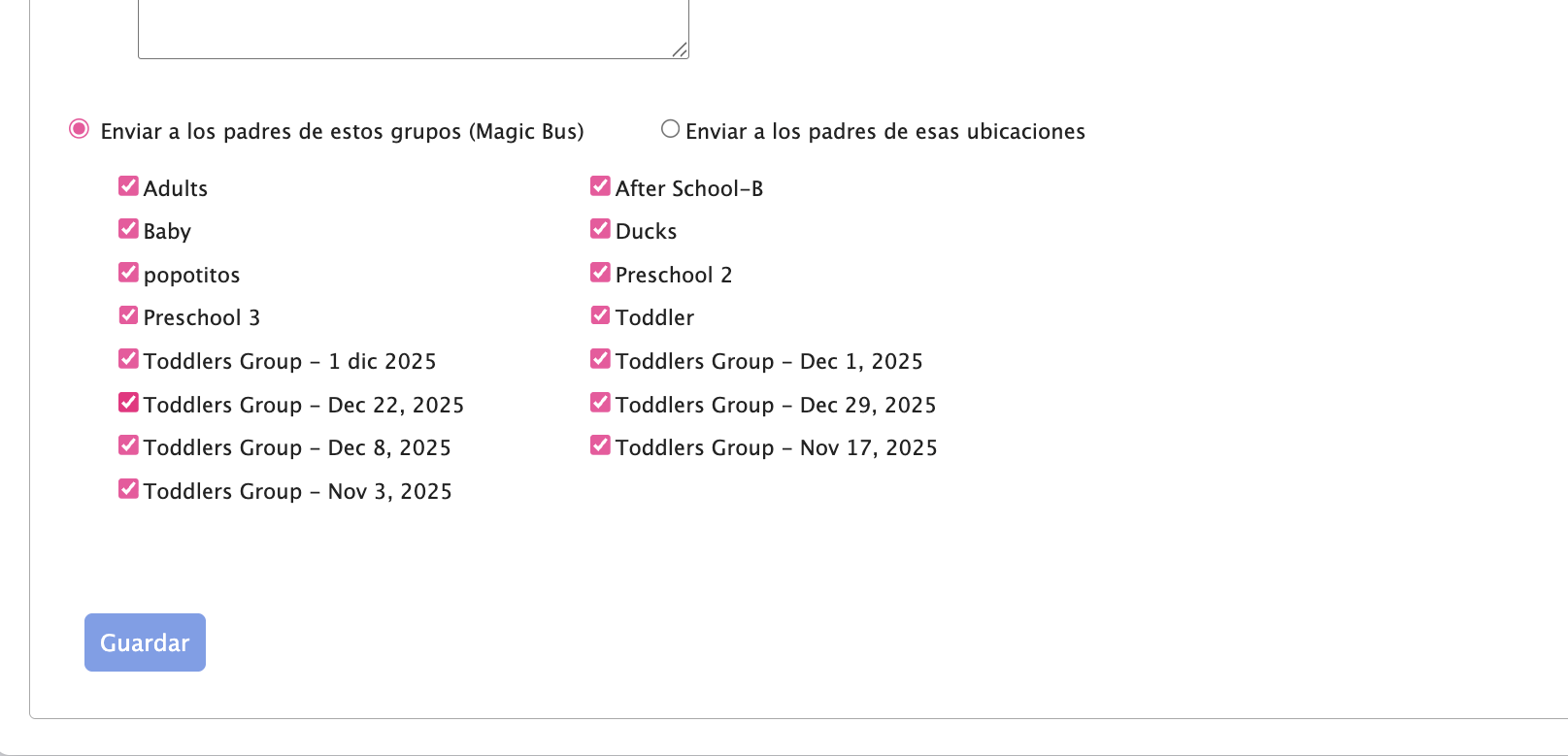3. Para enviar el mensaje a los padres de los niños de un salón específico, selecciona Enviar a los padres de esos grupos y luego elige los salones correspondientes.