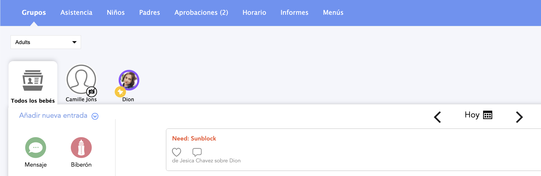 Asegúrate de haber seleccionado el salón correcto en la página de Salones. Los nombres de los niños de ese salón aparecerán en la parte superior de esta página.