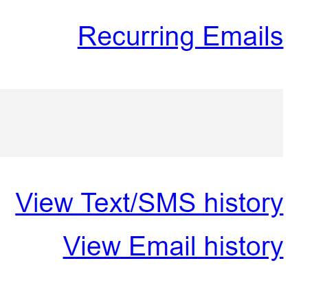 Puedes ver el historial de mensajes de texto (SMS) o correos electrónicos y programar envíos recurrentes semanales o mensuales a todos los padres seleccionando los enlaces correspondientes en la página de Enviar Correo / Mensaje de Texto.