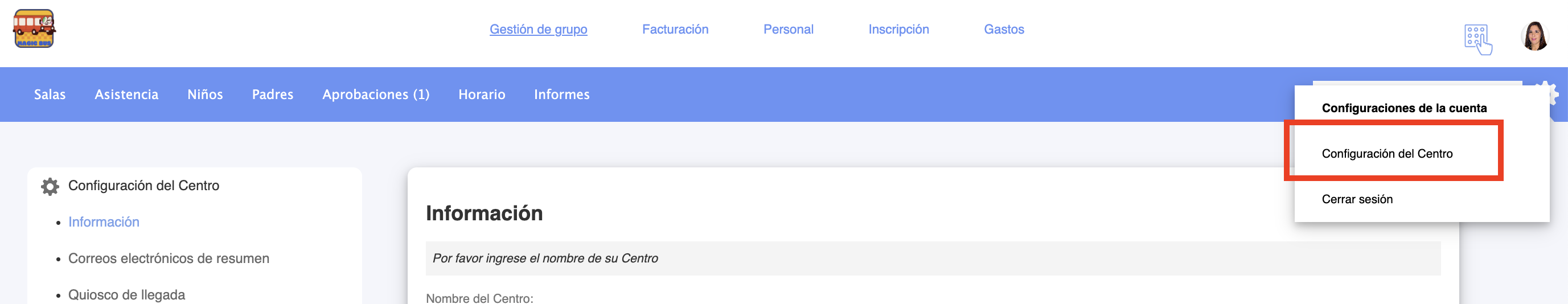 1. Inicie sesión en Daily Connect Web y vaya a Configuración de Centro