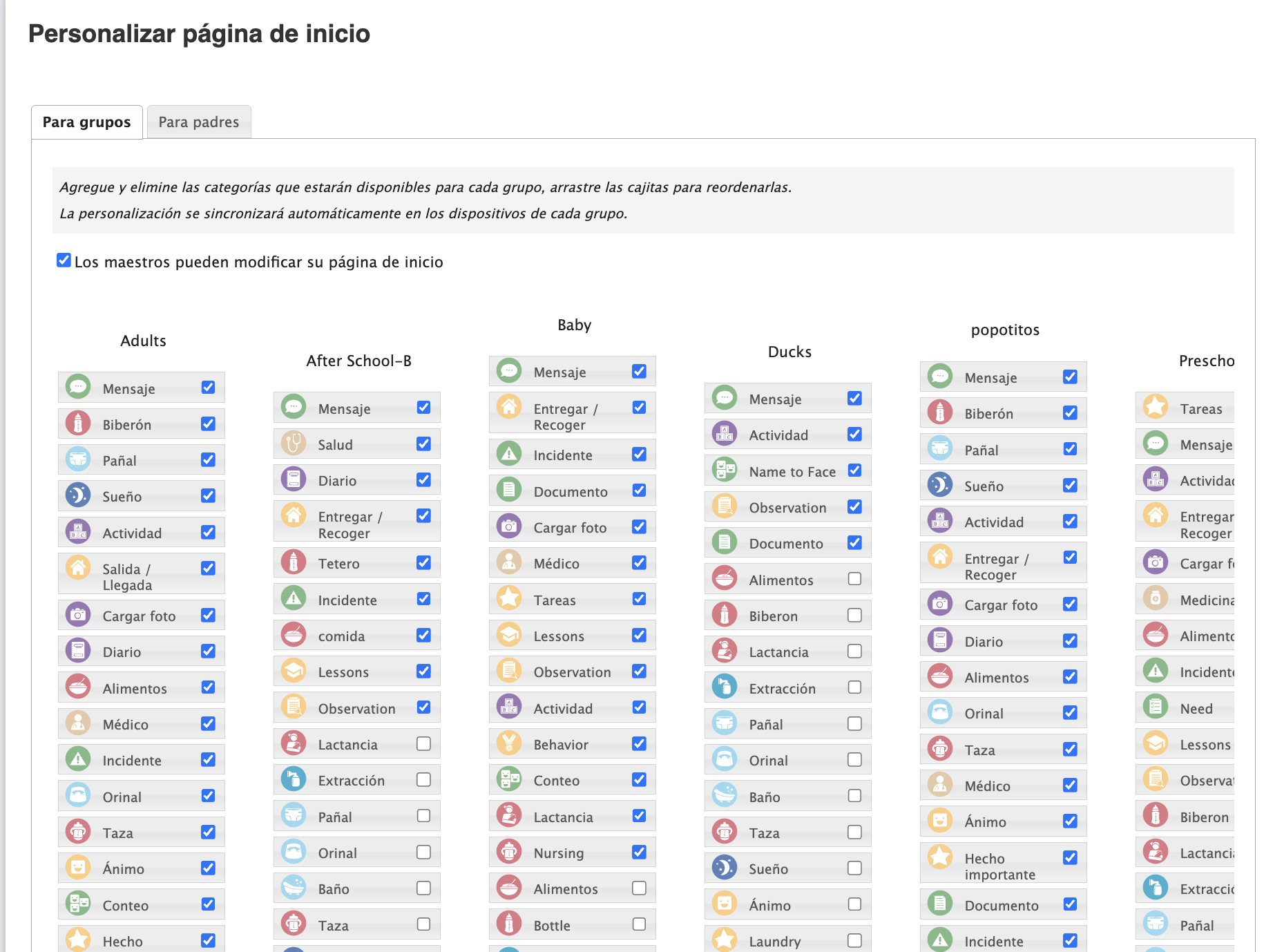 Daily Connect Le permite personalizar la página principal y las etiquetas de acuerdo con las necesidades de cada grupo. Al personalizar la página principal, puede agregar, quitar y reorganizar las categorías disponibles para cada grupo. Además, puede modificar el título de cada entrada y cómo aparecerá en la línea de tiempo del niño o niña.