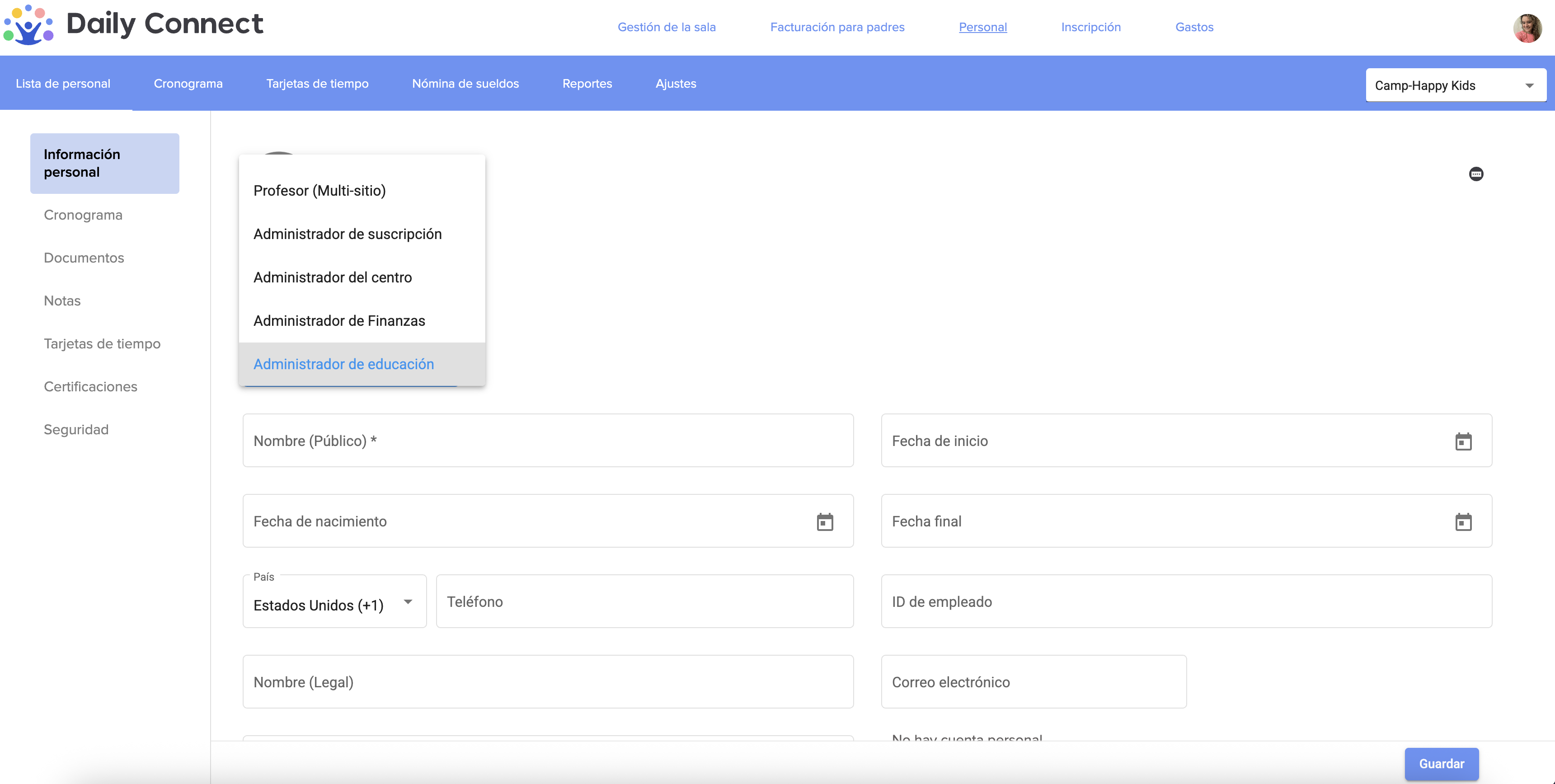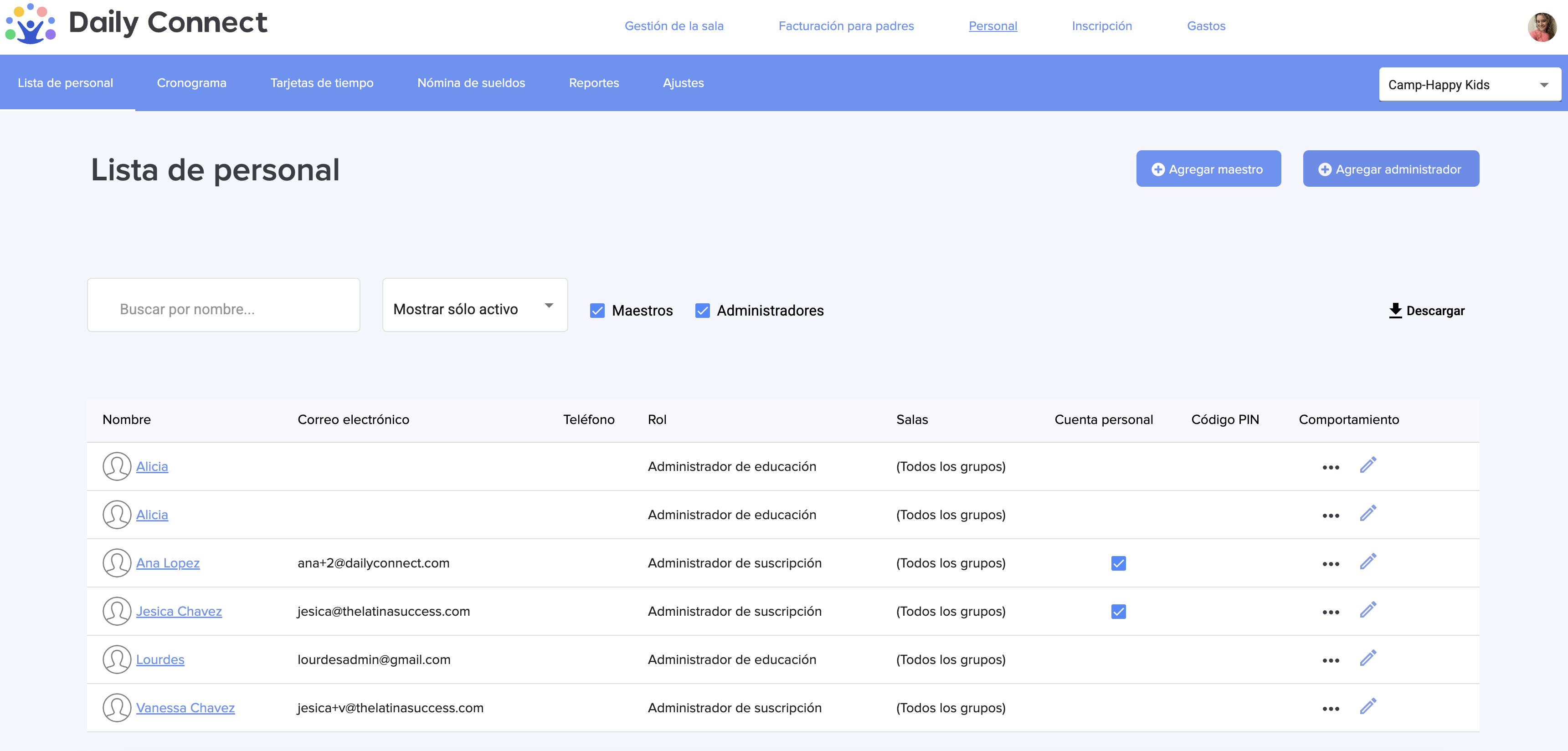Después de registrar una cuenta para tu centro de cuidado infantil, podrás agregar administradores a tu cuenta. Los administradores tienen el nivel más alto de acceso dentro del sistema. Existen distintos tipos (roles) de administradores, y cada uno cuenta con privilegios específicos.