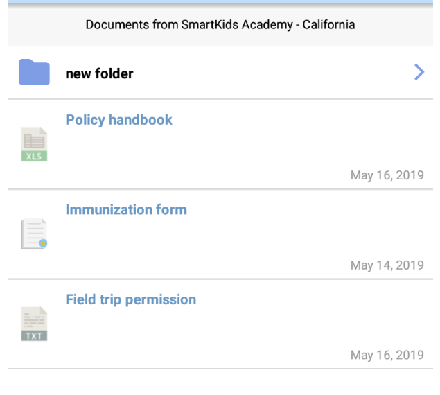 Esta función permite al administrador subir formularios y documentos que estarán disponibles para los padres en cualquier momento. Todos los padres pueden acceder a estos formularios y documentos desde la app web o la app móvil.