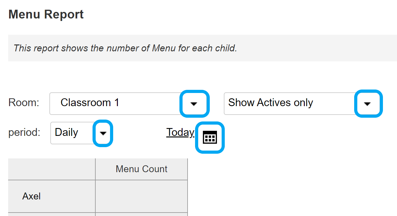 El reporte de menú muestra la cantidad de meriendas, desayunos y almuerzos servidos a los niños en cada salón de tu centro educativo.
