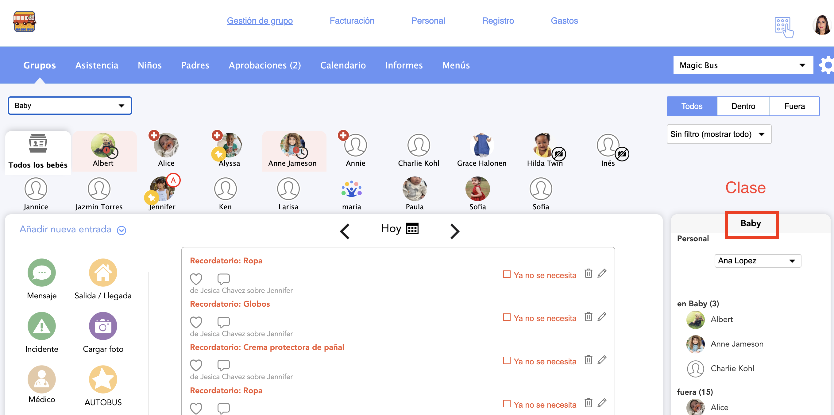 Como maestro, puede documentar cada parte de su día en el aula. Puede registrar diversos eventos durante el día de un niño en forma de una entrada. Esta entrada se añadirá al historial del niño, permitiendo que sus padres tengan una visión de lo que su hijo ha hecho durante el día y sean alertados de cualquier asunto importante.