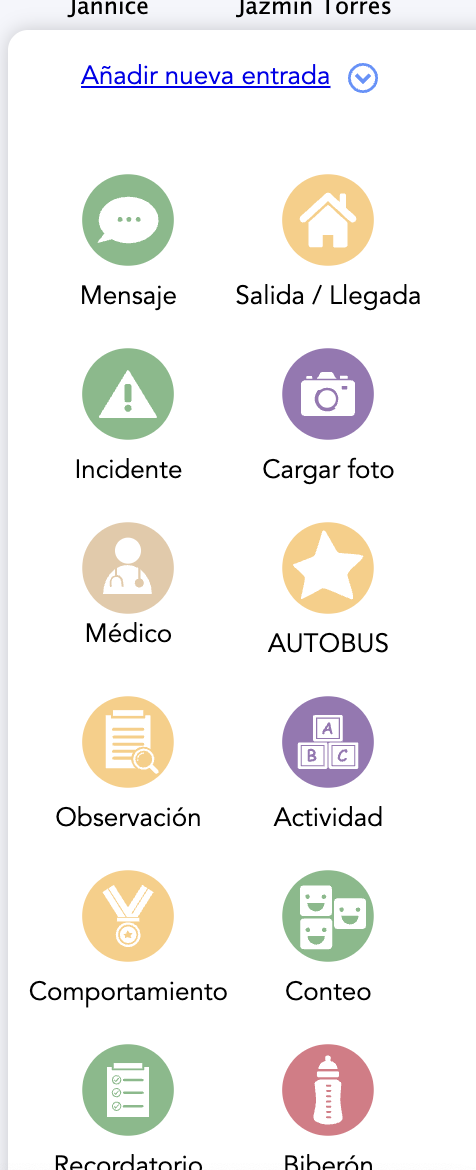 Las fotos solo se pueden añadir a las entradas de sólidos, pañal, actividad, reporte de incidentes, subir foto, diario, hito, salud, baño, medicamento y observación.