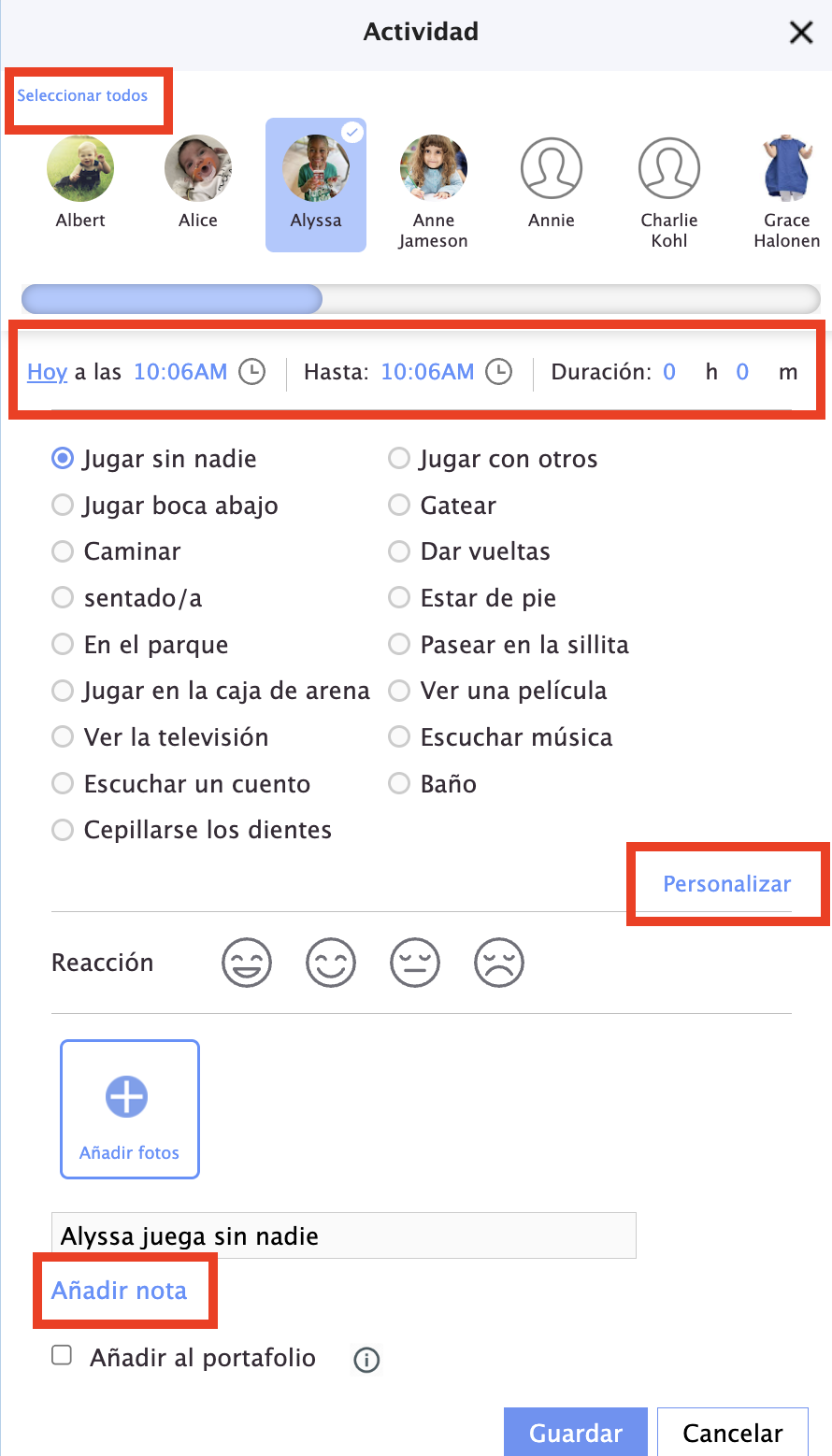 6. Marque la casilla Añadir al portafolio para añadir la entrada al portafolio del niño.