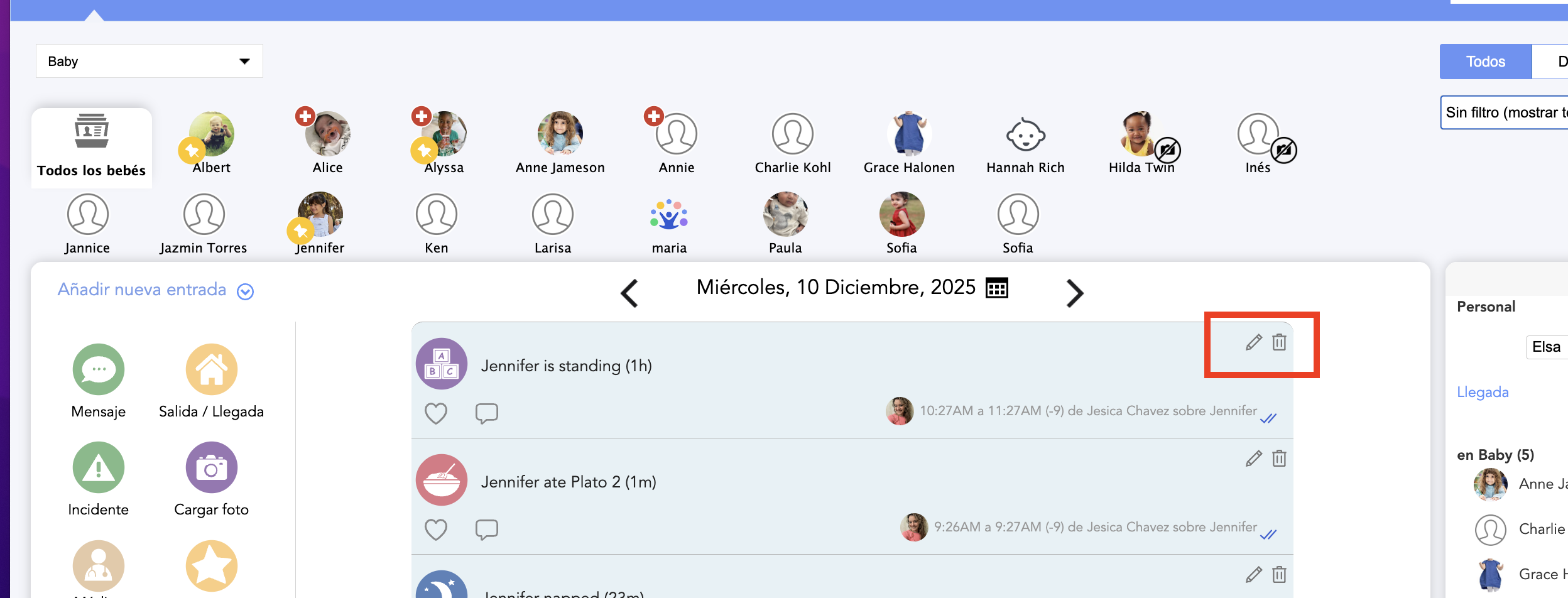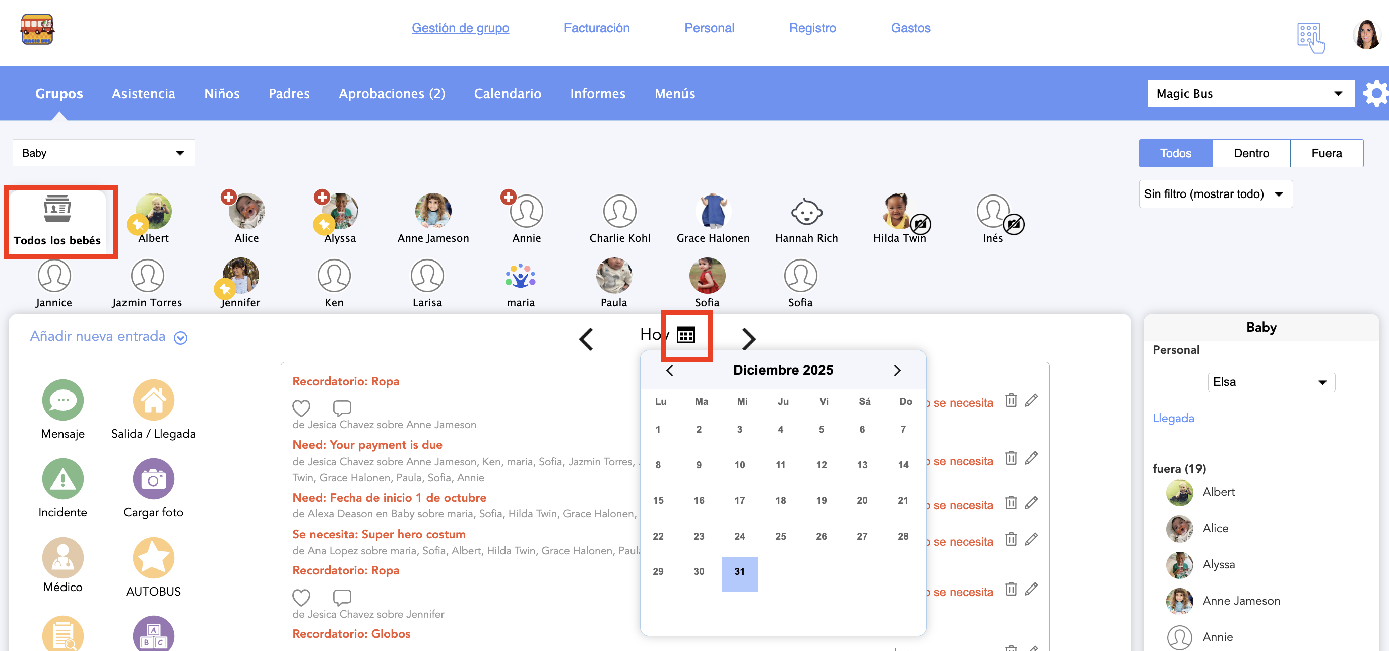 Para ver las entradas realizadas para un niño específico, seleccione al niño y luego seleccione el icono del calendario.