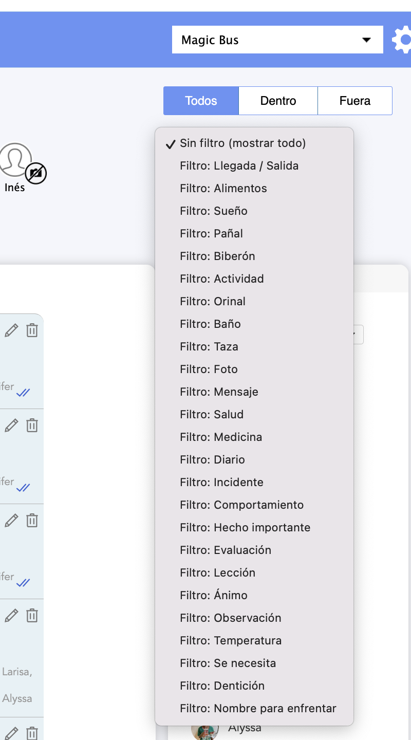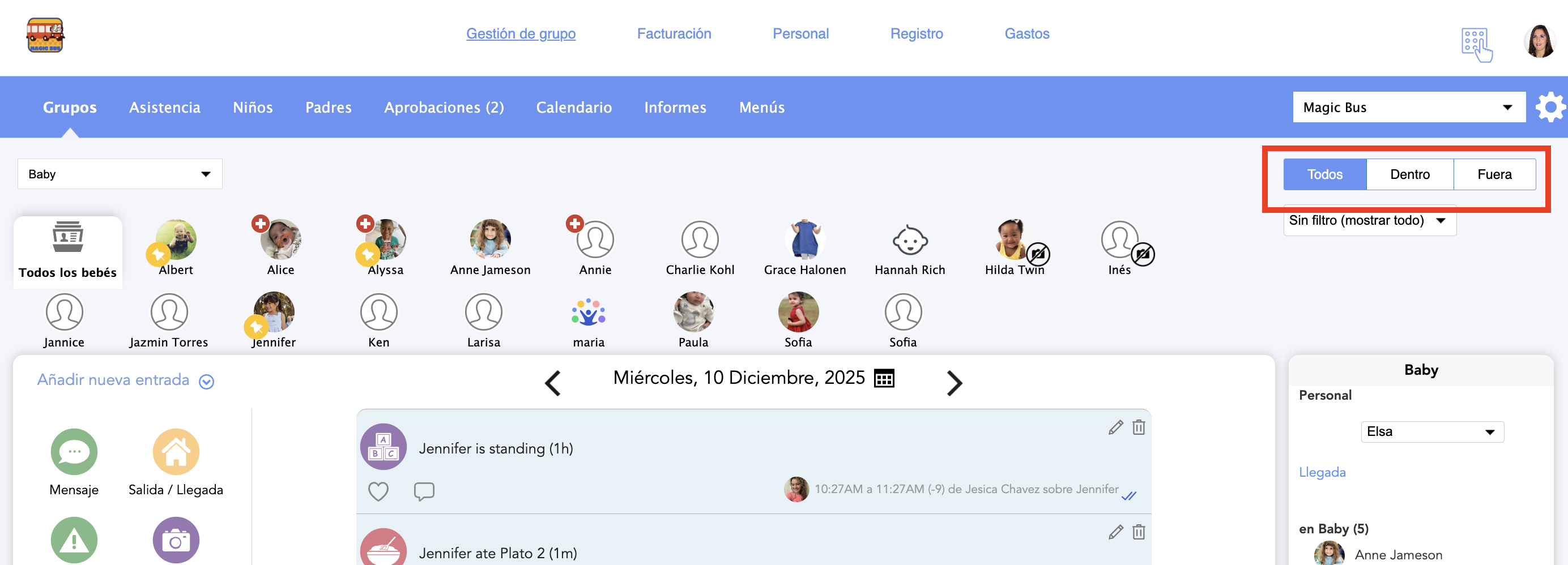 Seleccionar Dentro para mostrar solo a los niños que han registrado entrada.