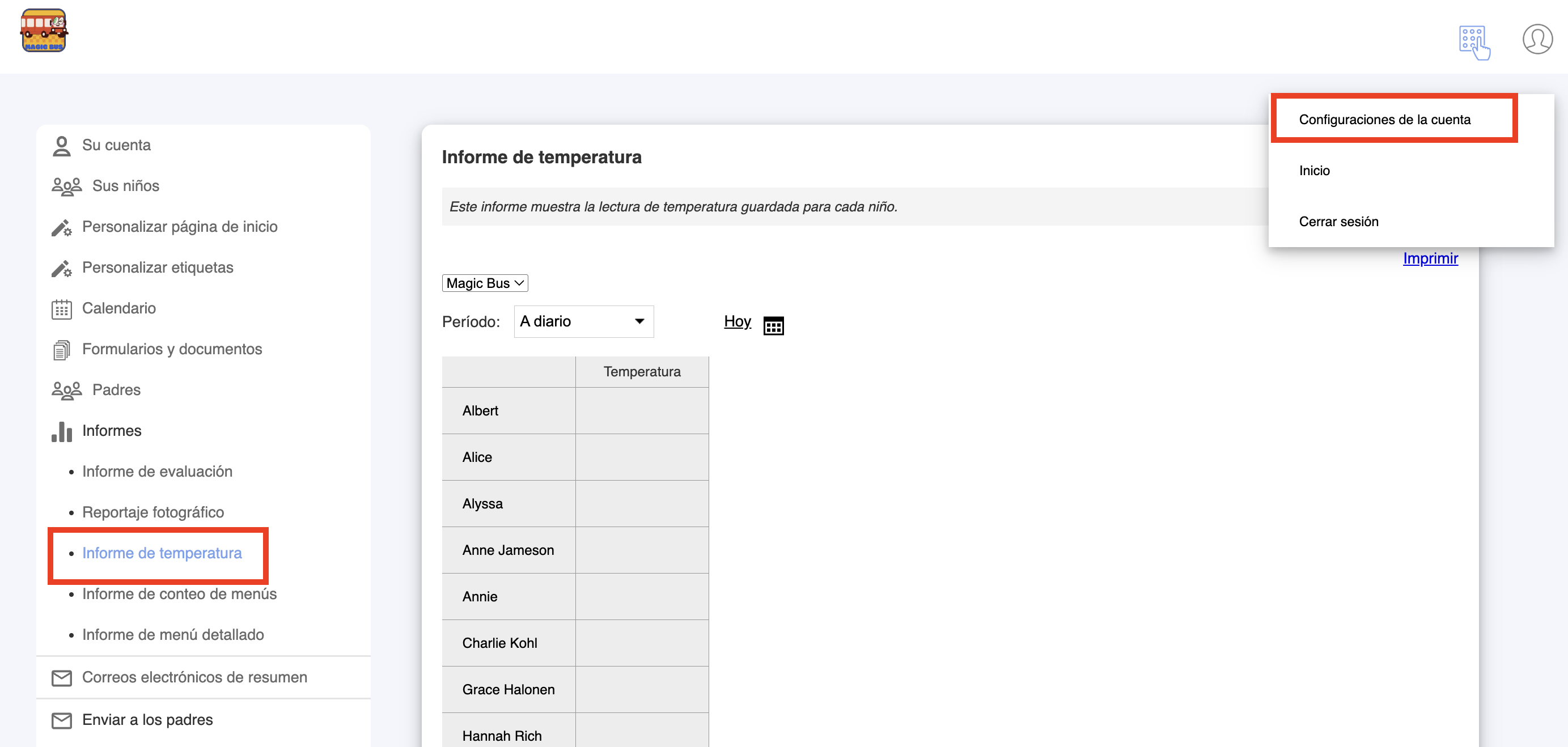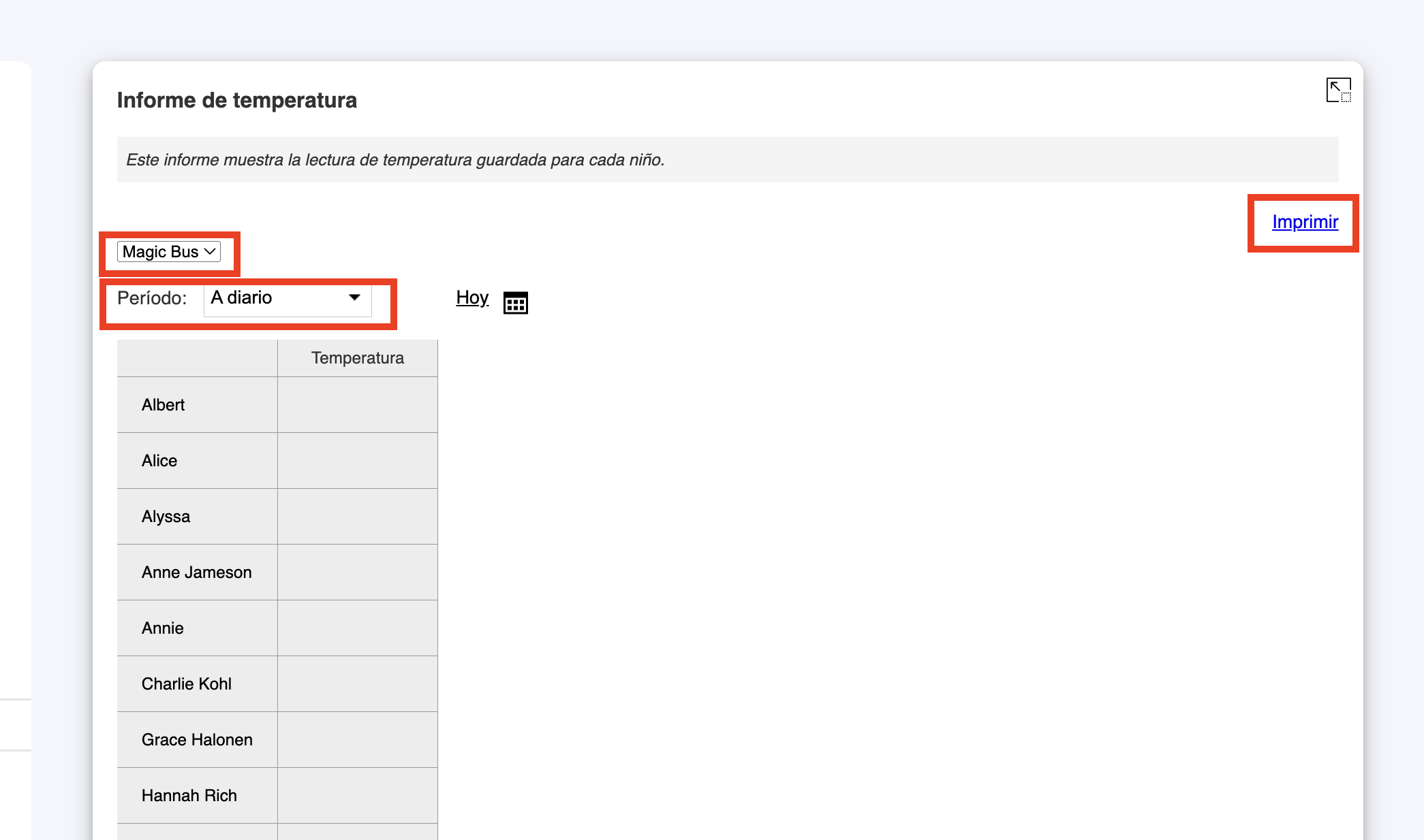 2. Seleccione el grupo (si es que está asignado a más de uno) y el periodo del informe. Si lo desea puede imrprimirlo.
