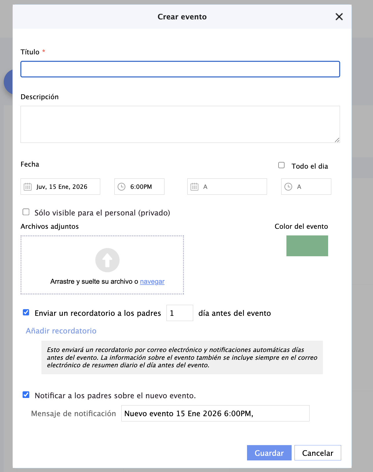 2. Complete la información necesaria para crear el evento y haga clic en Guardar:
