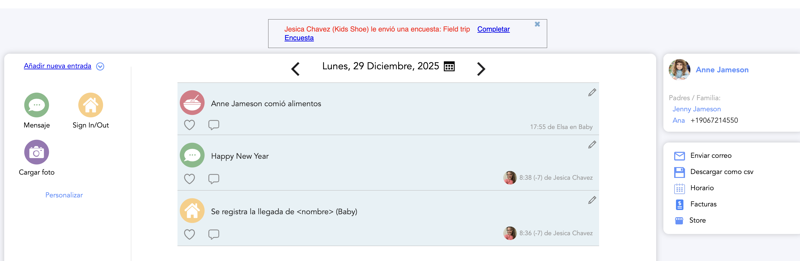 Como padre, puede hacer seguimiento de cada parte del día de su hijo. Puede ver los distintos eventos que ocurren durante su jornada cuando los maestros los registran en forma de entradas.