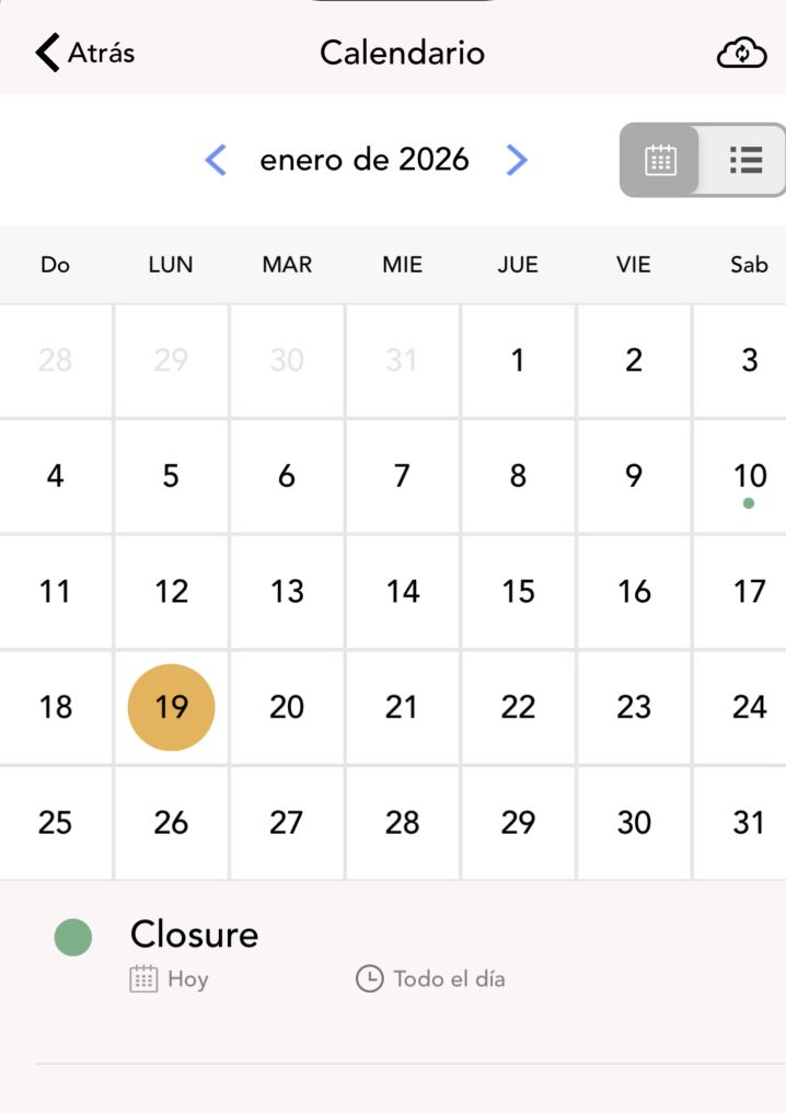 5. Seleccione el ícono del calendario para mostrar el calendario o toque el ícono de lista para ver una lista de todos los eventos del calendario del mes actual.